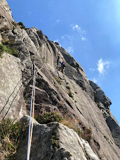 This time, we left the gentle tourist path and had a vauge path that took up steeply up to the base of the imposing granite tower. As we reached the base of the rock, I stripped off to my pants to cool down. Surveying the view back to the lake, we saw Barney making his way up to us at Olympic speed. He was up with us in no time, so we climbed as a sociable team of three. Naturally, we had the crag to ourselves.