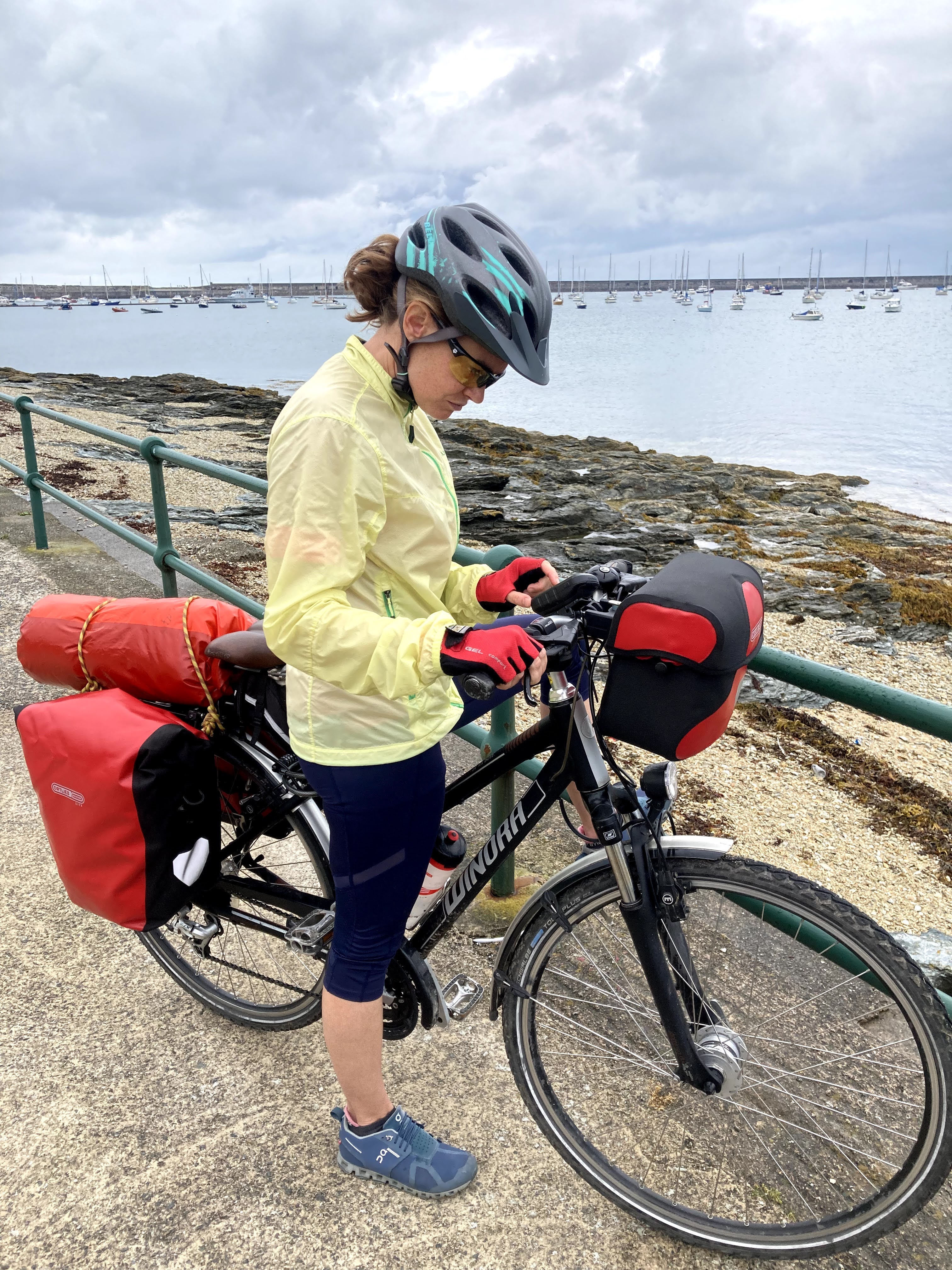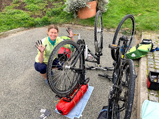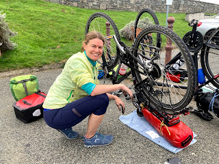 Although neither of us had ever repaired a broken chain, we were prepared for this potential tour disaster. I had previously broken a chain in the Ogwen Valley. Having limped back to The Cottage, we resolved to purchase the required tools and chain links to facilitate a repair should this happen further from home. So with the scantest of instructions, we fathomed out what to do, with Clare taking on the business end of the operation, while I offered support! Our first attempt got the chain on and repaired, but threated incorrectly, so we had to actually break it again to rethread! After a very satisfying repair, we discovered that we’ve also packed some thin gloves in the repair kit to avoid getting oil on our hands! Too late!