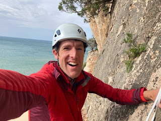 There must have been a storm in the night as the wind had blown things around the balcony while we slept. It was still windy at breakfast, so we set off to nearby Spiaggia dell’Arenauta, where there was a beach and some climbing that looked like it might be sheltered. We climbed a few good routes down by the sea, by the bolts were rusted and not very confidence inspiring. We backed up the lower-off, which was in even worse shape. A shame as the climbing was really nice.
