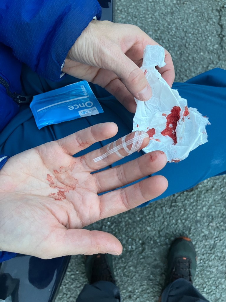 The rock is very angular and in places incredibly sharp. The second (top) belay was placed very strangely, with two bolts but a long way back and far apart. I rigged things so I could still see Clare and signalled for her to climb. This is when the drama started…