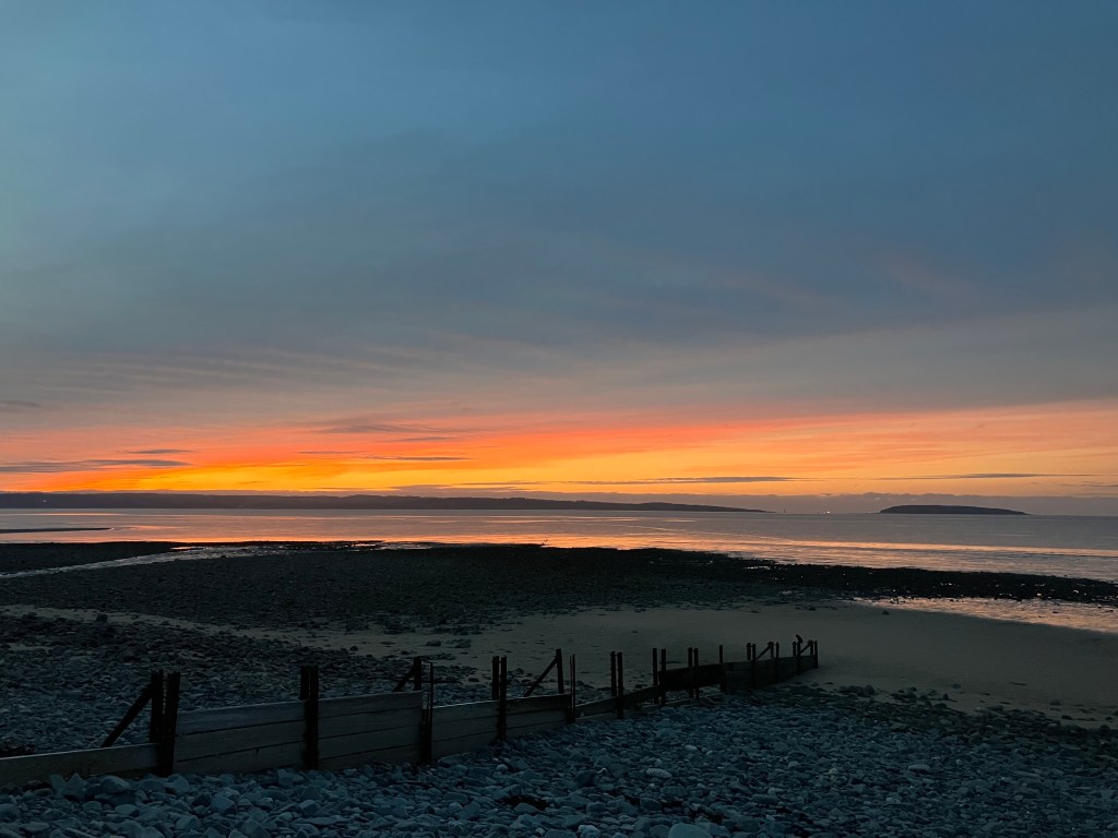 As Clare moved up from the belay, the ledge she was standing on collapsed beneath her and she suddenly grabbed the rock to hold on. Unfortunately this was at one of the very sharp edges, and after the shock of the unexpected drop, she looked down to fine blood dripping from her fingers! Some rapid first aid was self applied and the climb was easy enough for her to join me one handed. We beat a hasty retreat as the light began to fade, but in the way home stopped off at the beach to sit on the wall and watch the colours change into a stunning sunset. A full day out..