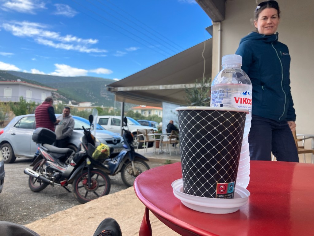 We checked out around 11am and set off on the road, which was mostly straightforward, except for a few Google ‘shortcuts’ through olive groves on dusty tracks. We had a great stop for a drink and break at a random little town, an hour short of our destination. The cafe was full of old men and thick with cigarette smoke. The bar tender sold me a cappuccino and I picked up a couple of bottles of water to go with it, while Clare went outside to find some fresher air. He asked for €3.00 and I assumed he’d not seen the bottles I’d picked up. Yes, yes he said, €3.00 total. Bargain, I thought and held my breath while I paid and hurried out to reach the sanctuary of the open air terrace. We sat by the roadside watching blokes come and go on old bikes, while we fought our way through the thick coffee sludge.