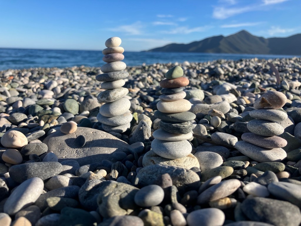 We took several swims and relaxed on the busy beach – when I say busy, I mean we could see about seven or eight other couples stretched along the kilometre length of pebbled beach! The swimming and snorkelling was still idyllic and stacking rock therapeutic.