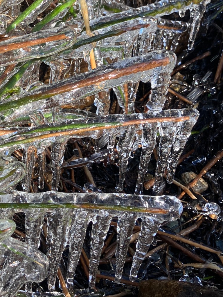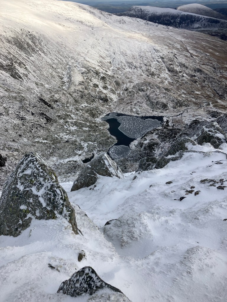 We toyed with the idea of a circular walk around the top of the cwm above its frozen lake, but decided instead to turn our backs on the wind and return a similar way. Halfway down the ridge near the rocky step, we put on crampons for a safer descent. The ground must have been really saturated over Christmas as there were long flows of ice across all the grassy sections. With spikes on our feet we could walk across these with satisfying ease.