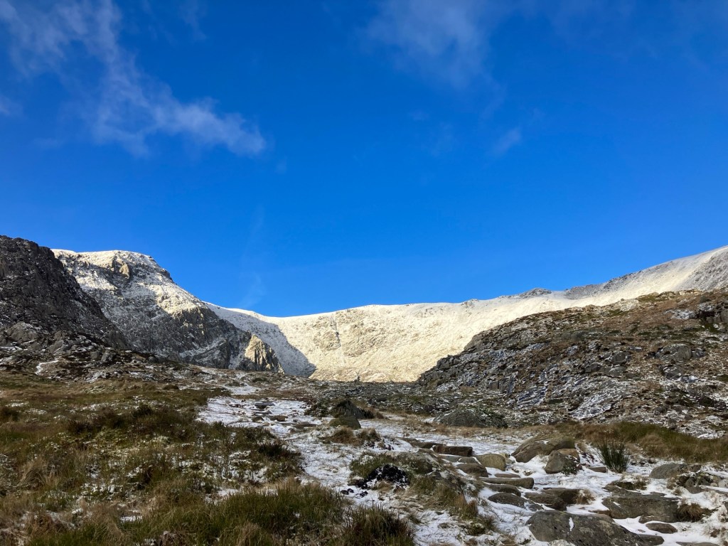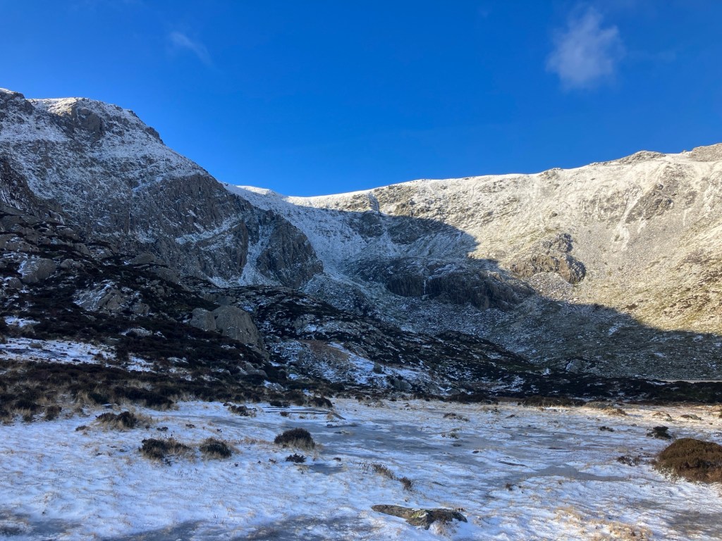 The ground was frozen hard, but the snow was only on the higher ground. There were good ice falls forming in Cwm Idwal, but not enough to climb on. We chose to hike into Cwm Lloer. This was to maximise time in the sunshine as well as to be sheltered from the north winds.