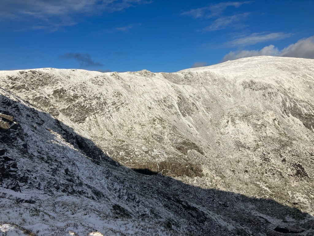 It also gave us the option of climbing a gully/ridge if overnight snowfall allowed. As it turned out, there was much more ice than snow, so the hike up to the summit of Pen yr Ole Wen along the rocky ridge appealed much more.