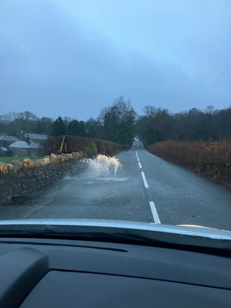 I took a group of students up a nearby hill to feel the wind in our hair and see what 80mph winds would feel like. Walking uphill with the wind behind us was easy, but to get back down we needed goggles to protect us from the pelting rain! In the drive home, there were the usual wet weather water features in the road drains.