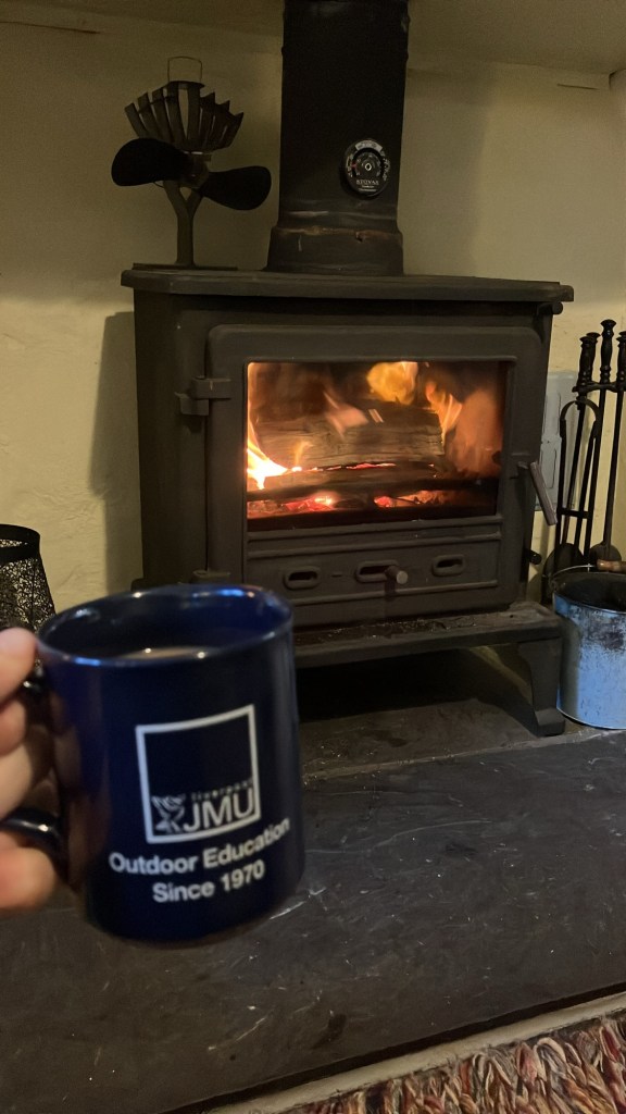 It was exactly 27km van to van and we were both suitably exhausted by the time we got home. We managed to get the fire lit and a cup of tea brewed before collapsing down on the sofa to warm up. A university mug seemed appropriate after the earlier chats! Brilliant.