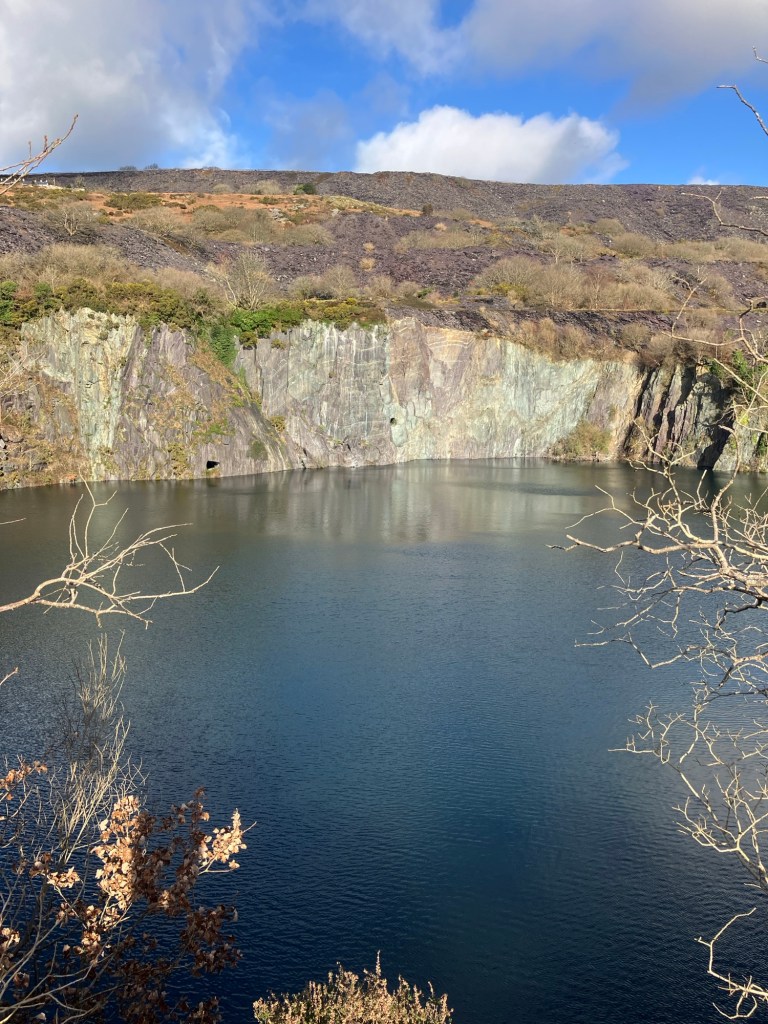 The views were superb and for a while we had a clear view down the valley to the snow covered summit of Snowdon. We took a rough track through the quarries, past several deep lakes. While stopping to peer off the edge of a cliff, we came across another couple – one of whom was one of my University Lecturers, from my undergraduate degree in Outdoor and Environmental Education! We had a good natter and swapped a few stories, before parting our ways and continuing on to the old slate courtyard that held the coffee roasters kitchen.