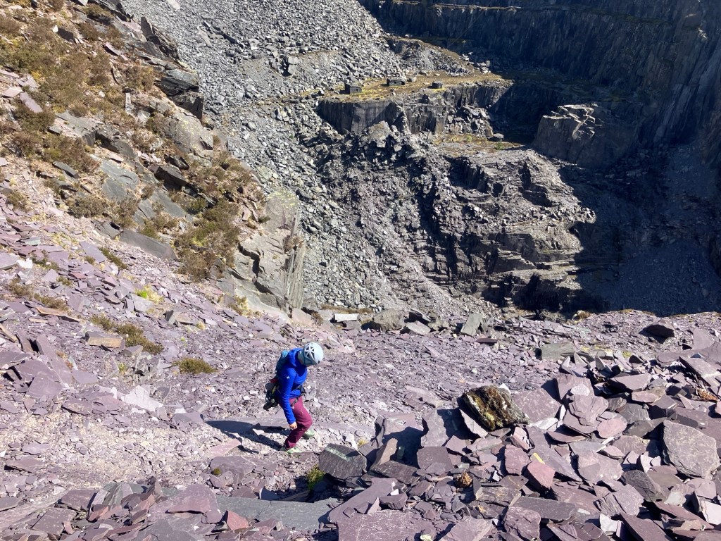 Up in the quarries, the views of Snowdon were great, but best enjoyed from the shelter of a rock pile! We sat and sunbathed for a little while, the geared up and hiked down to the base of the ‘skyline’ level.