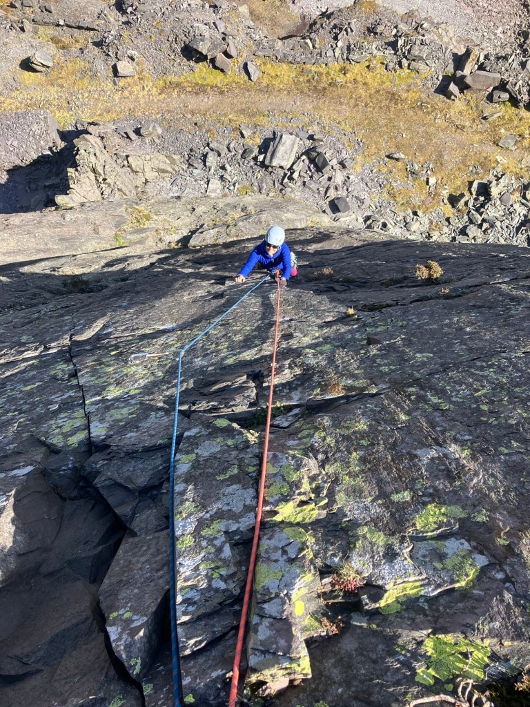 We’d chosen well and the rock was warmed from the sun yet sheltered from the cold wind. Our route followed the curving corner before finished up the steeper headwall.