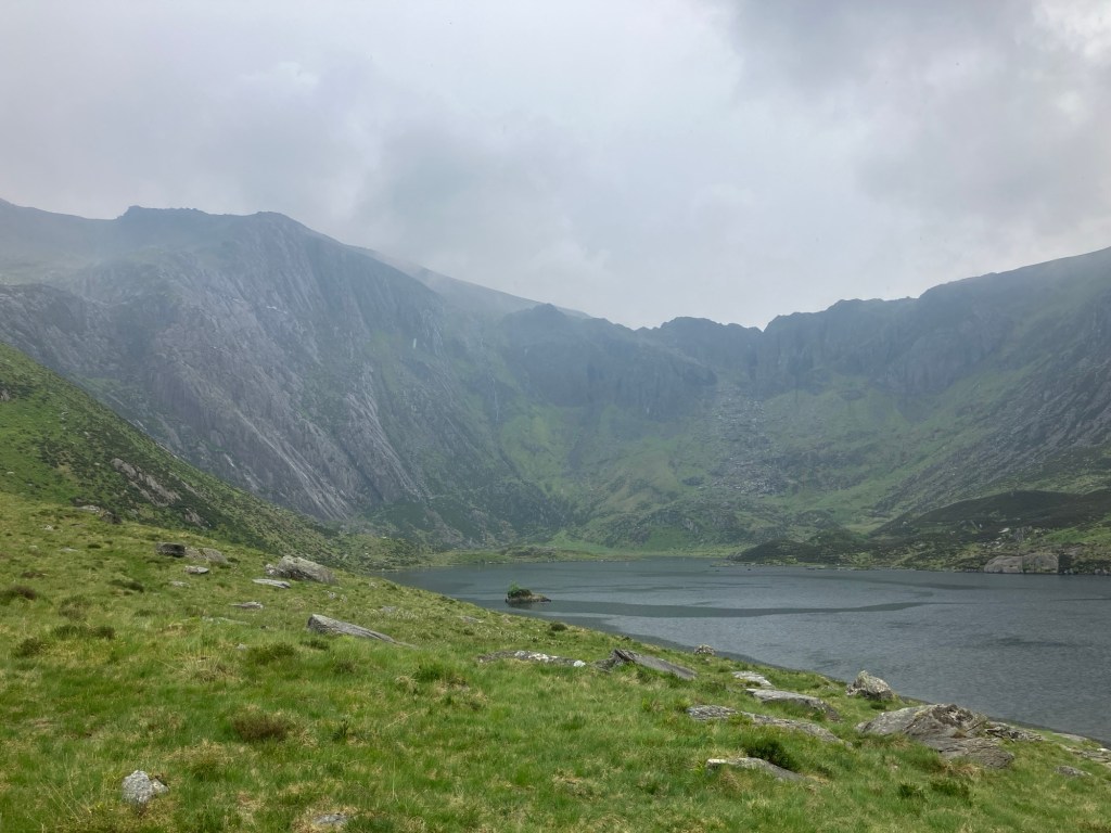 By the time the work was done, the skies had started to cloud over and on arrival in Cwm Idwal, John and I were somewhat disappointed to find warm rain suddenly pouring from the skies!
