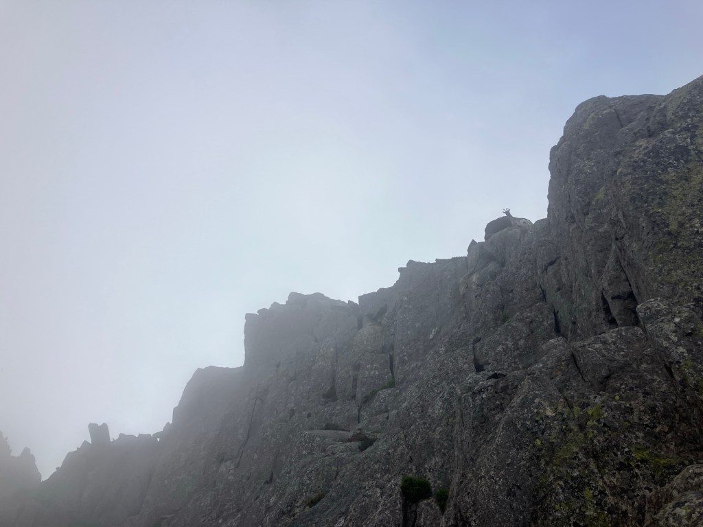 In the end, by the time we’d hiked up to the Heather Terrace, things dried up enough to do the classic climb ‘Grooved Arête‘ on the east face. The new ropes were by now safely stashed in the van and we’d resorted to taking an old ‘single’ mountaineering rope as that would work better for the climb.