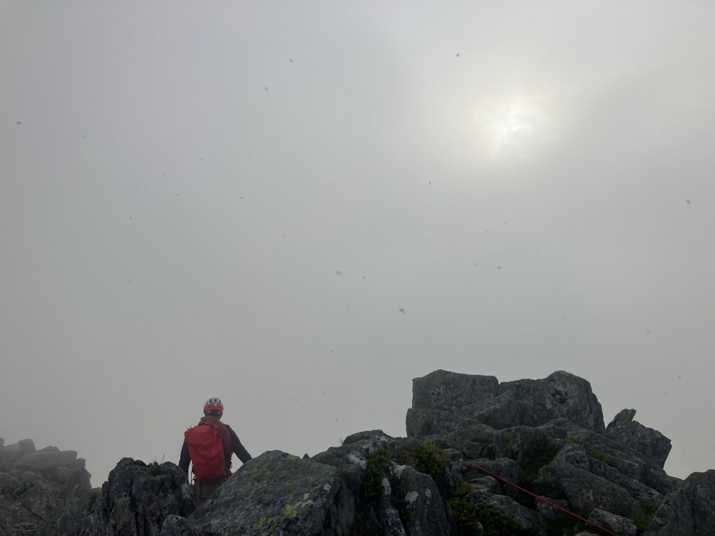 After climbing in the swirling warm mists, it was cool to top out on the summit ridge where the sun was just glimpsing through. All very eerie and atmospheric.