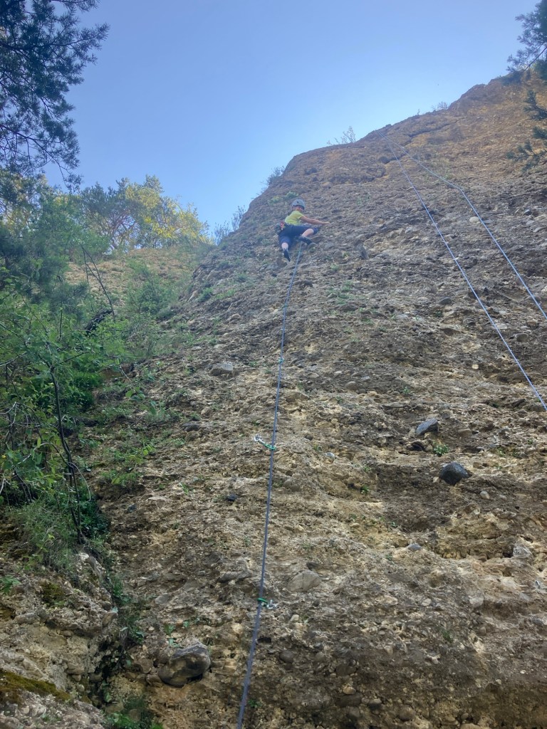 We finally got down to another of our local crags after yet another leisurely start. The balcony of our chalet is so nice, it’s hard to leave after breakfast! And as the crag is north facing and always shaded, there seemed no rush to get there.