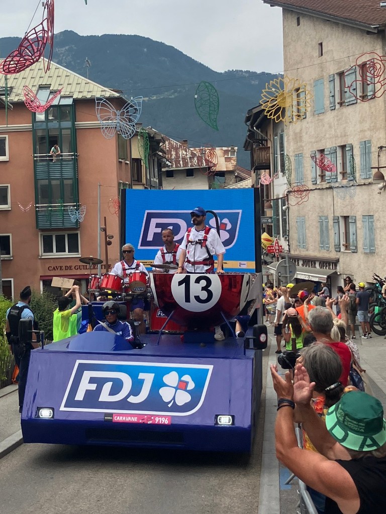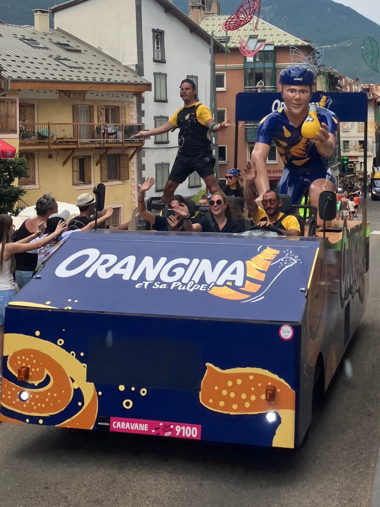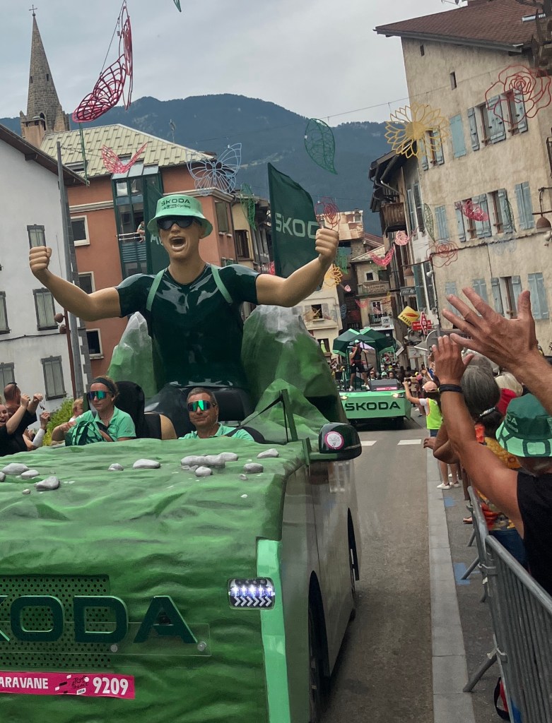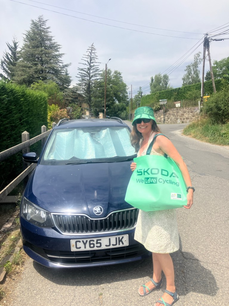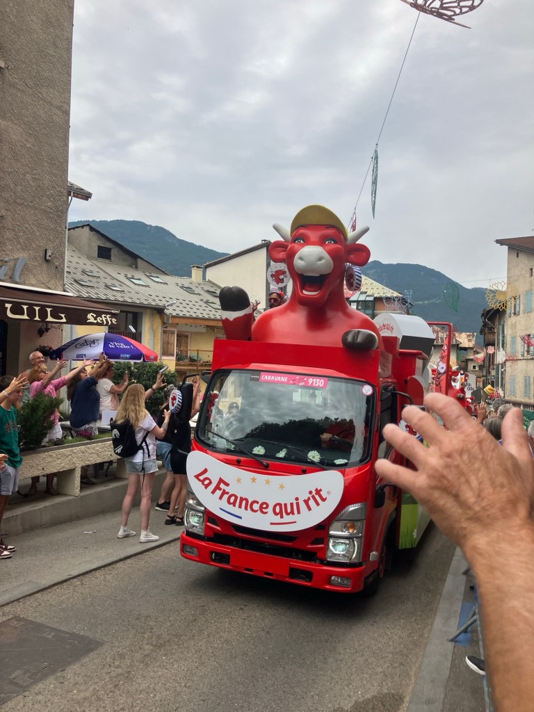 Luckily a slight over casting of clouds meant that temperatures were perfect to waving past ‘le caravan’ – a sort of carnival that passes through ahead of the bike riders. Free samples, hats, shirts, key rings, drinks and all sorts of merchandise were thrown into the arms of the crowds as they passed by woth music blaring! You couldn’t help getting caught up in ‘tour fever’!