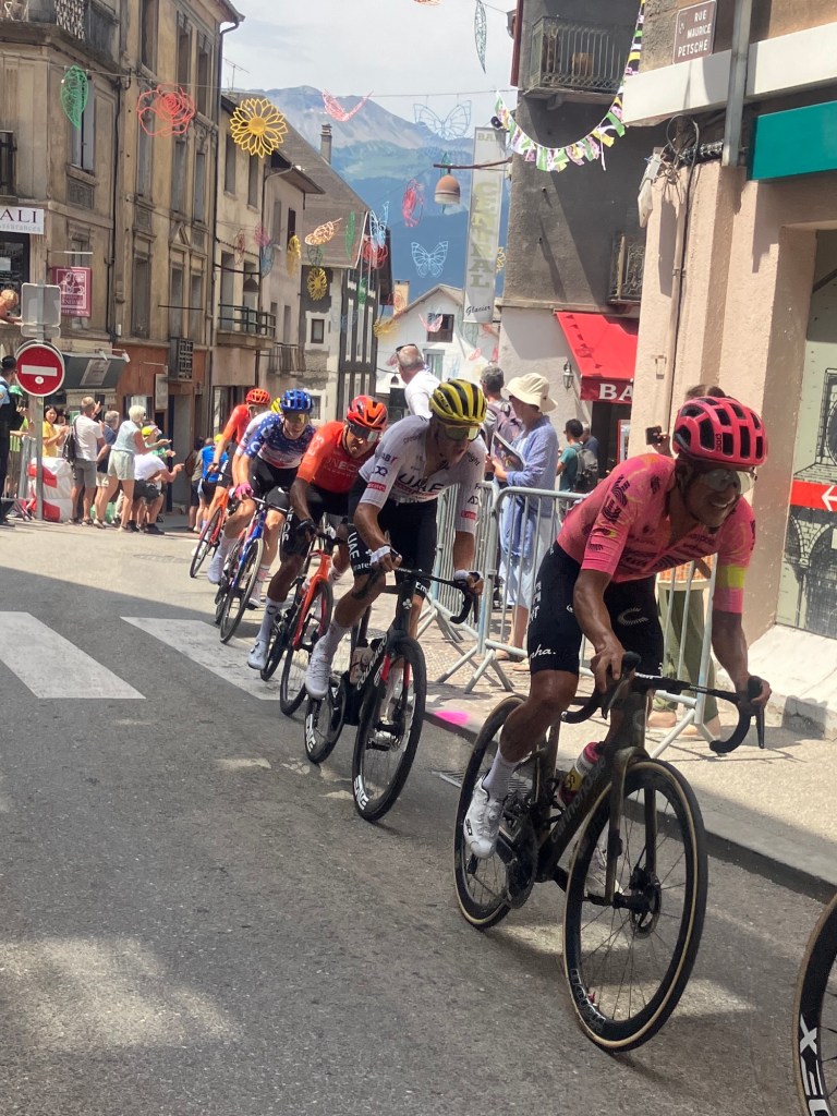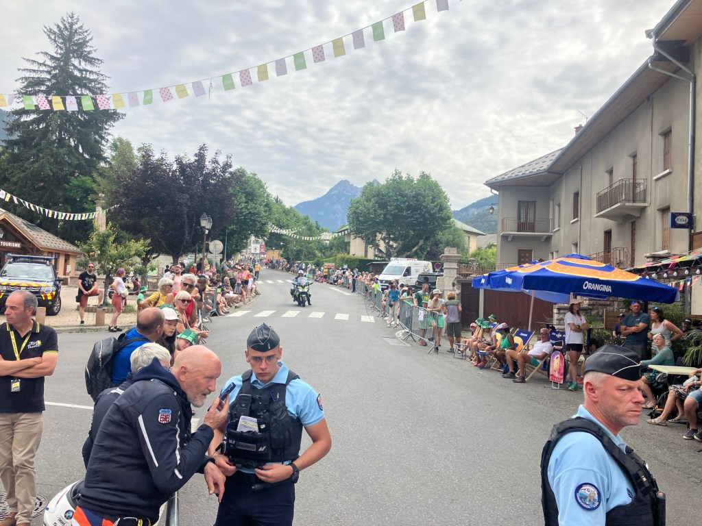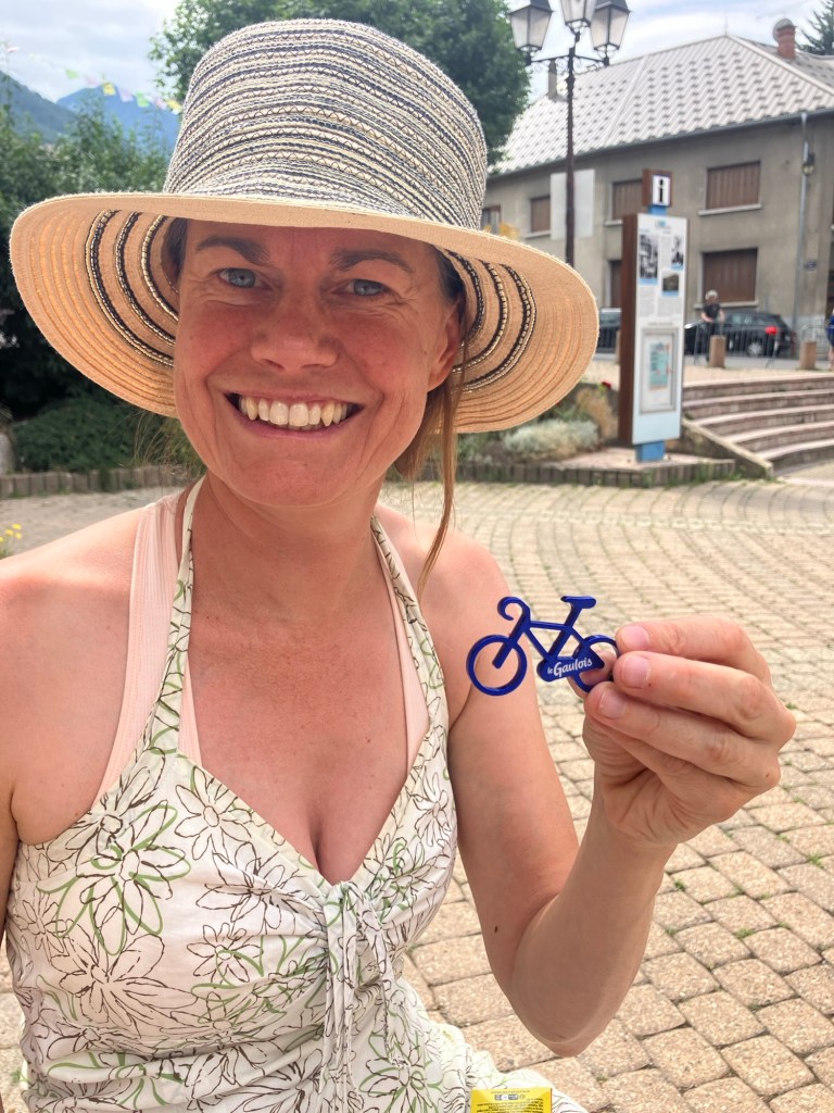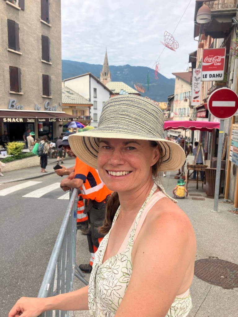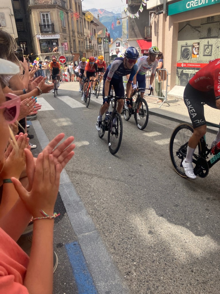 Luckily a slight over casting of clouds meant that temperatures were perfect to waving past ‘le caravan’ – a sort of carnival that passes through ahead of the bike riders. Free samples, hats, shirts, key rings, drinks and all sorts of merchandise were thrown into the arms of the crowds as they passed by woth music blaring! You couldn’t help getting caught up in ‘tour fever’!