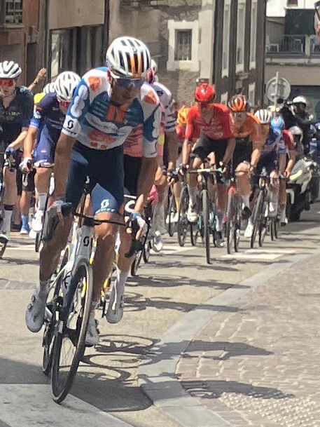 Then about an hour later a roar from the crowds further down the hill indicated the arrival of the peleton and seconds later a motorbike roared up the high street with hundreds of bikes in hot pursuit!