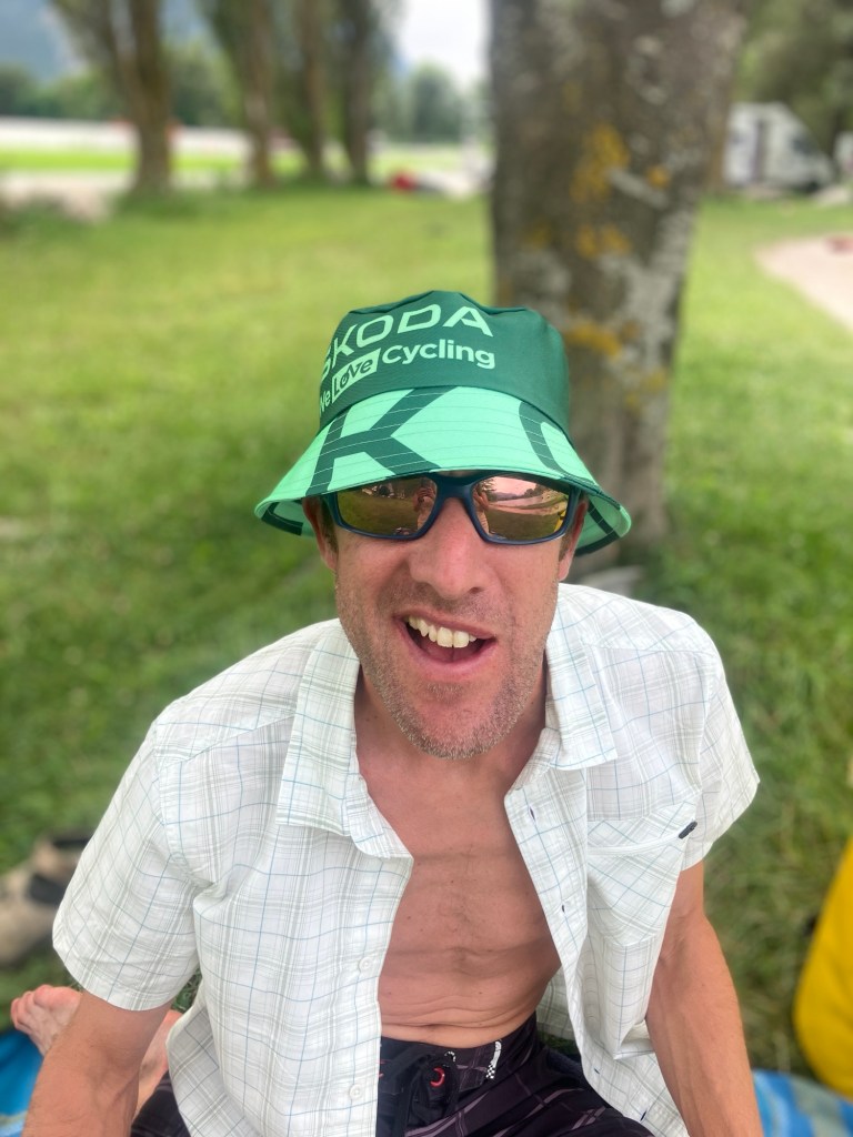 As the crowds started to disperse, we took a shady table in the local bar and had a cold drink while checking out our ‘swag’ that had been thrown at us by the sponsoring companies. The logistics and money involved in the tour are breath taking – Skoda have certainly spent a lot – and we’ve a lovely new hat and bag from them!