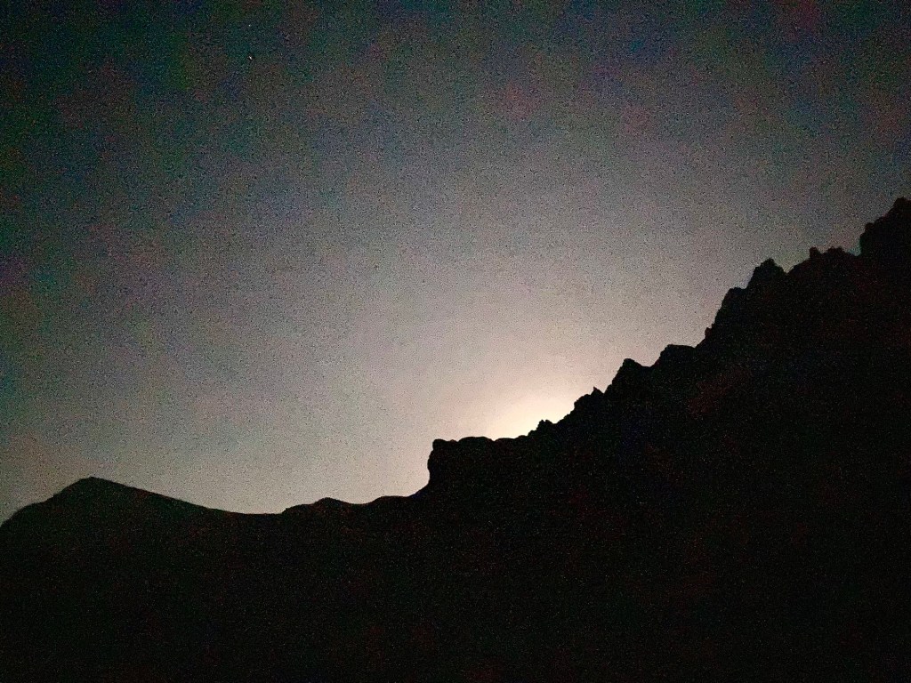 After dark, we hoped to see the full moon rise, but the rocky ridgeline that surrounded our camp prevented us seeing the moon. However, it tracked close to the ridge, reflecting light off all the surrounding cliffs in the cwm. It was pretty spectacular, even if we didn’t get to see the moon itself.