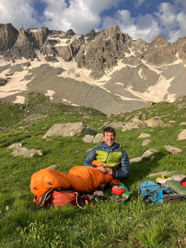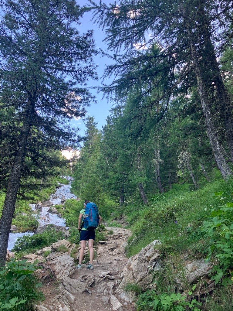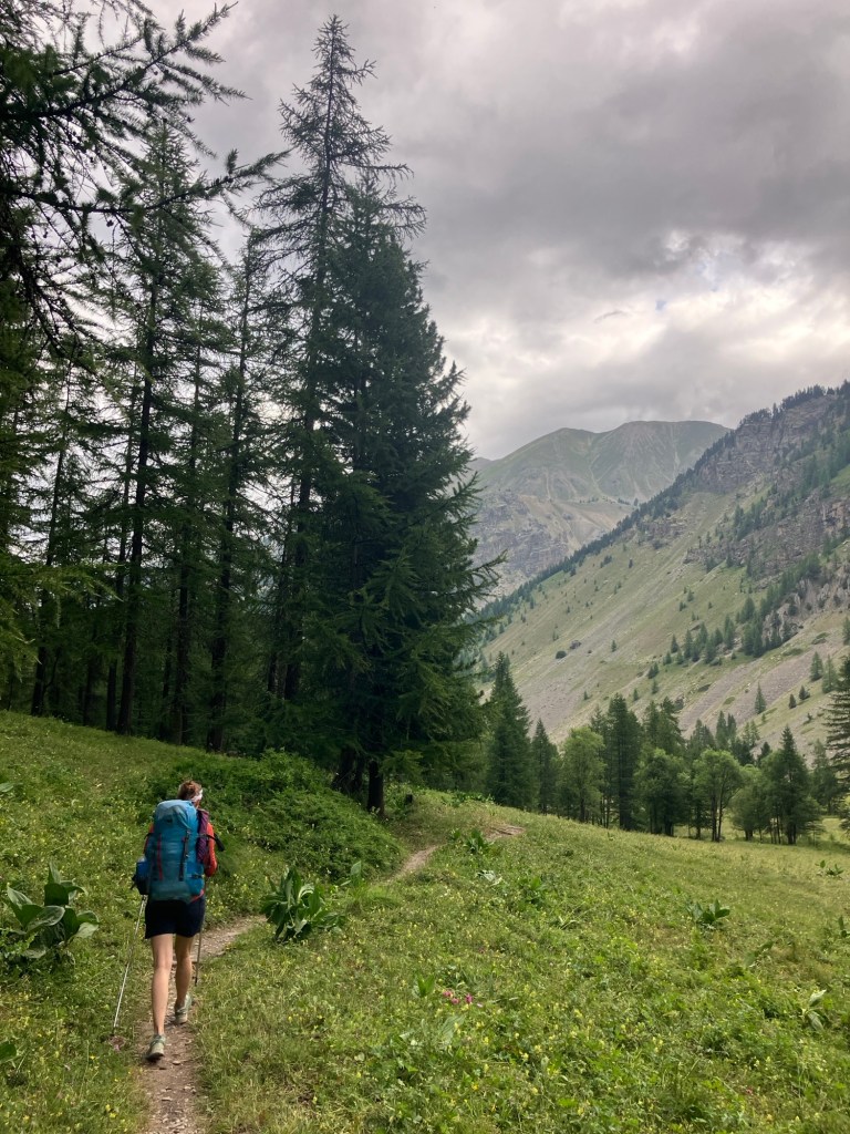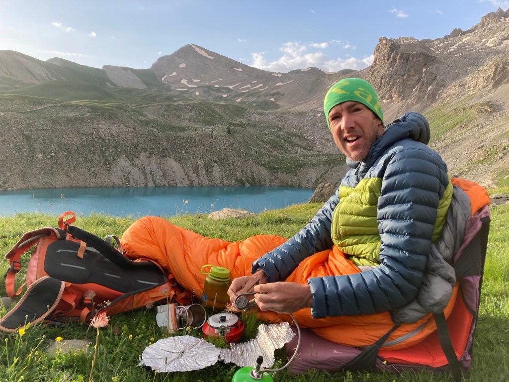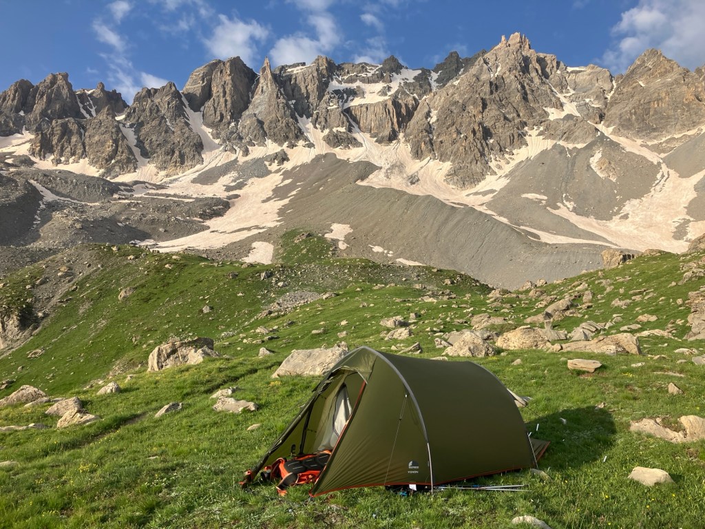 We’d planned on going on an overnight adventure in the mountains, so spent the afternoon, relaxing, getting some kit ready and letting the hot temperatures pass by. Then just after mid afternoon, we drove up to the village of Ceillac. On the way we picked up a hitch hiker, who turned out to be a trainee mountain guide. He looked pretty tired and as we talked about climbing, he explained that he’d just climbed a new 300m route in the mountains, with technical difficulties of 7b+! Once through the high alpine town, we parked up at Chalet Melezes, where a trail takes you up through some nice shady forests. You can height quickly and after leaving the tree line came across a herd of horned sheep and Lac Miror.