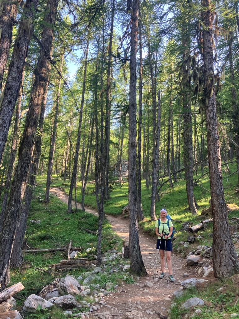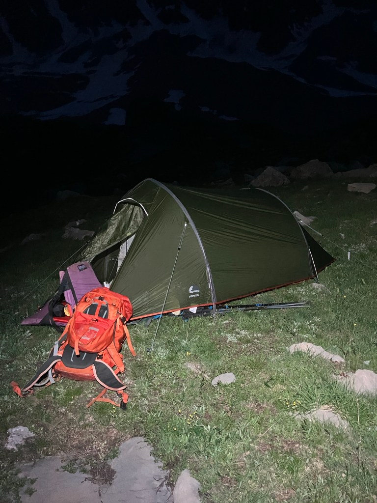 At nearly 2500m, we were above the tree line and much more into ‘alpine’ mountain territory. The views were just brilliant. There were a few others with the same idea as us already camped up by the chapel and lake, so we pressed on a little further to a secluded highpoint. We were pretty exhaushted by this point, so were very glad to find a tiny flat area of grass on which to pitch our little tent. But first we got our camp chairs out, wrapped up warm and cooked a big dinner. Swimming was tempting, but we didn’t want to get too cold and an evening breeze put us off!