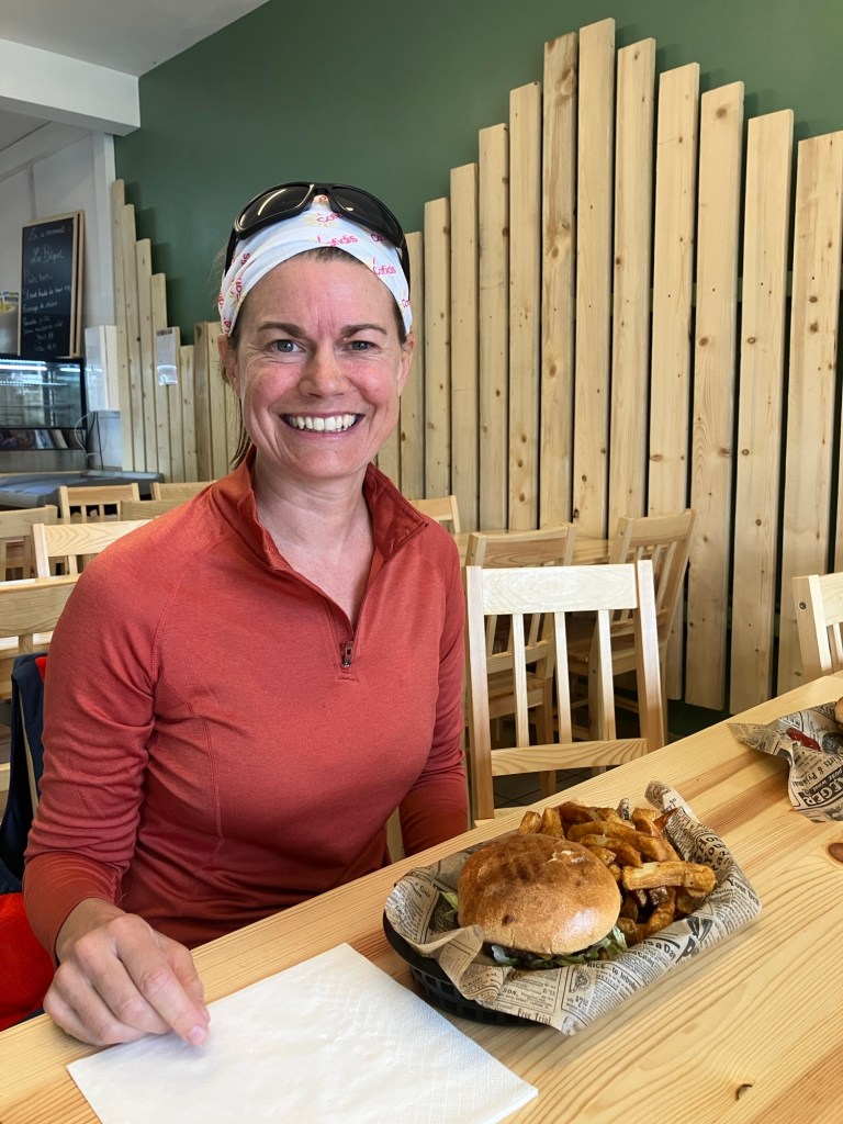 We’d been given a good soaking by the time we reached the car, but we were still dry on the inside. We were pretty exhausted having descended 860m and travelled nearly 8km. I was quite keen to check out the terrace of the old chalet cafe and enjoy the mountain views of this new area, but the thick low cloud and wet weather made this seem a little less appealing, so we rolled back down the hill to Guillestere, where Clare located a suitably cool cafe for a ‘second breakfast’. It was just before midday when we pulled up and demolished a couple of burgers and a plate of chips without pausing for breath. It was just what we needed!