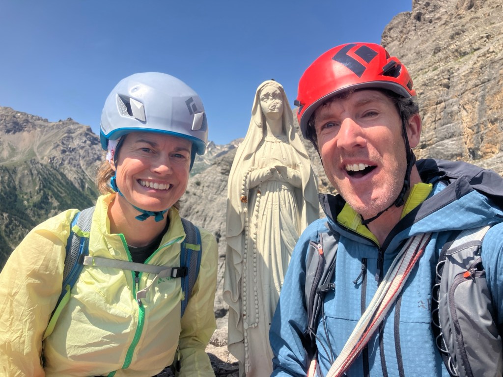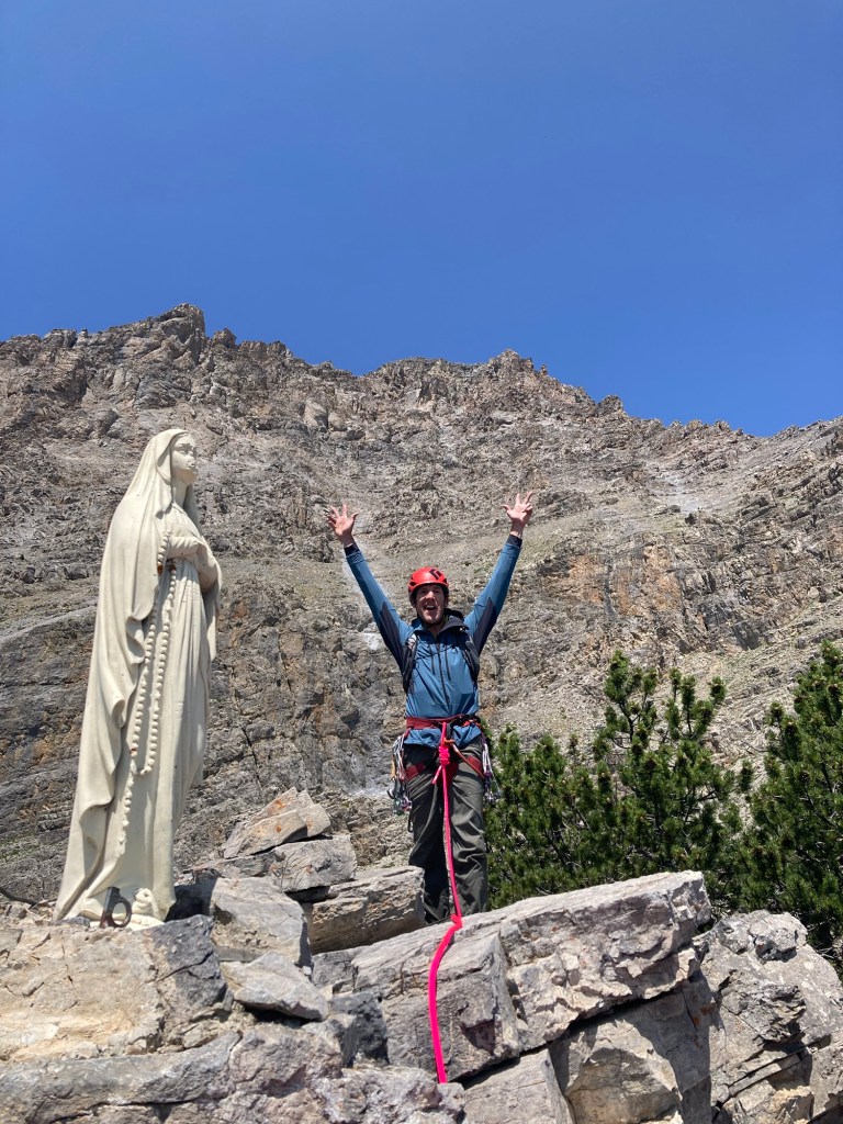 I set off up what the description called ‘final wall’, following a cool crack pitch that had plenty of protection and even a few bolts to clip. It was a great moment, when I pulled over the last blocks, to be greeted by the summit Madonna statue. We’d made it!