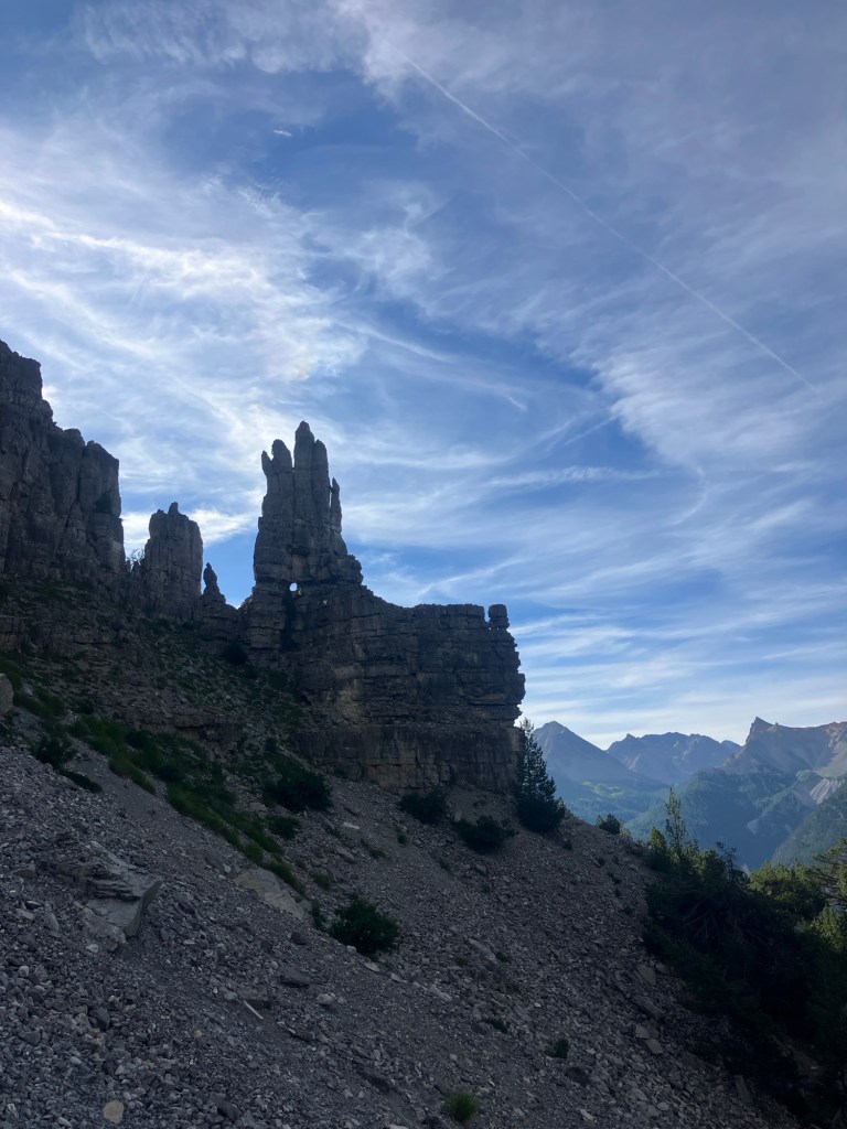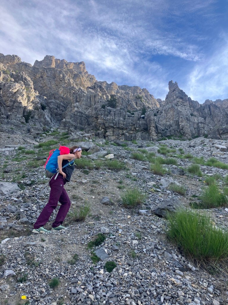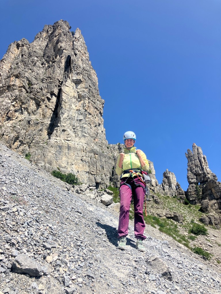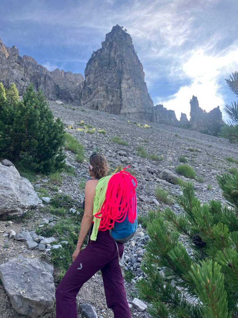 Our early start paid dividends as we were able to walk upto the base of the climb in the cool morning shade, having driven over and had breakfast in the valley before setting off at just after 8am. It’s a long, but well marked path up steep scree slopes to get to some smaller pinnacles (called Donjon del la Monaca) and the base of the climb.