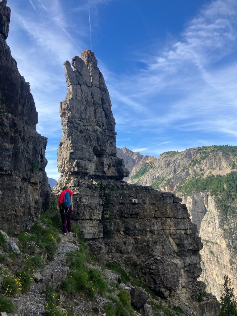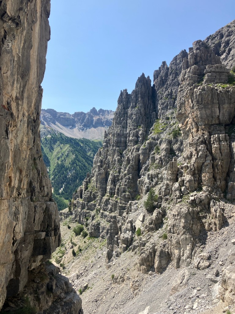 Before panicking too much, I looked around at my options and saw just below me on a second, slightly lower spire, a solid looking chain belay! I’d climbed the wrong peak! Carefully, but very grateful to be heading towards something much more solid and less terrifying, I down climbed, and escaped across back to the correct route.
