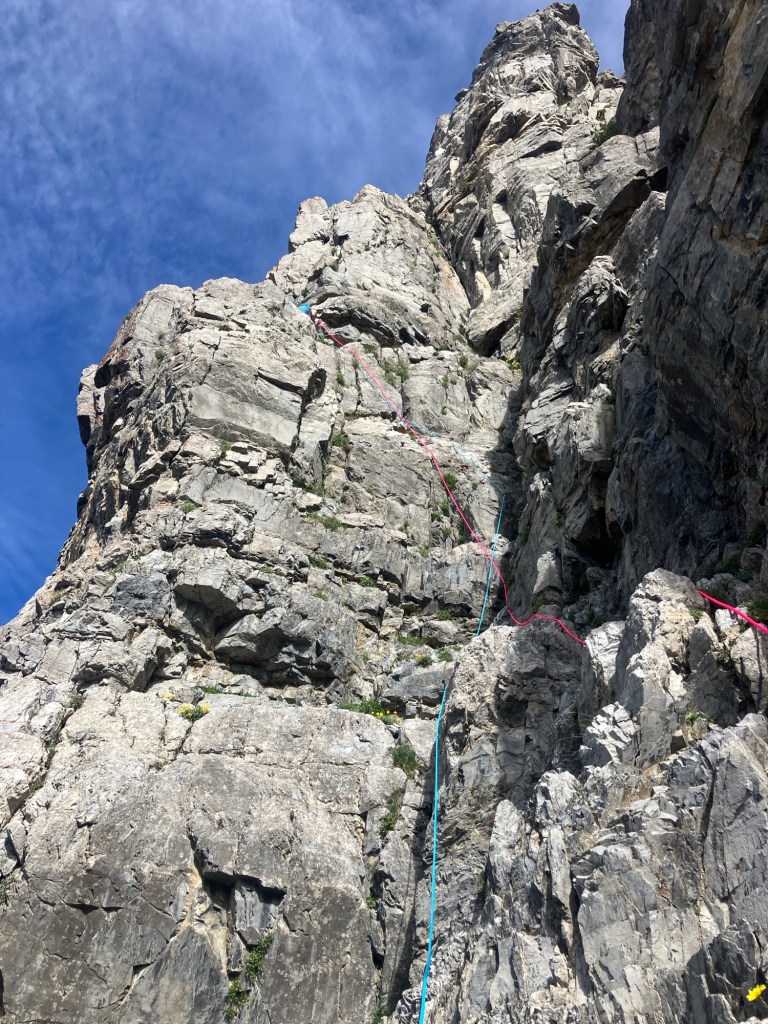 (Alpine Grade ‘Difficile’. Bolted belays and a couple of bolts/pitons per pitch)