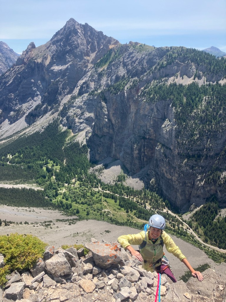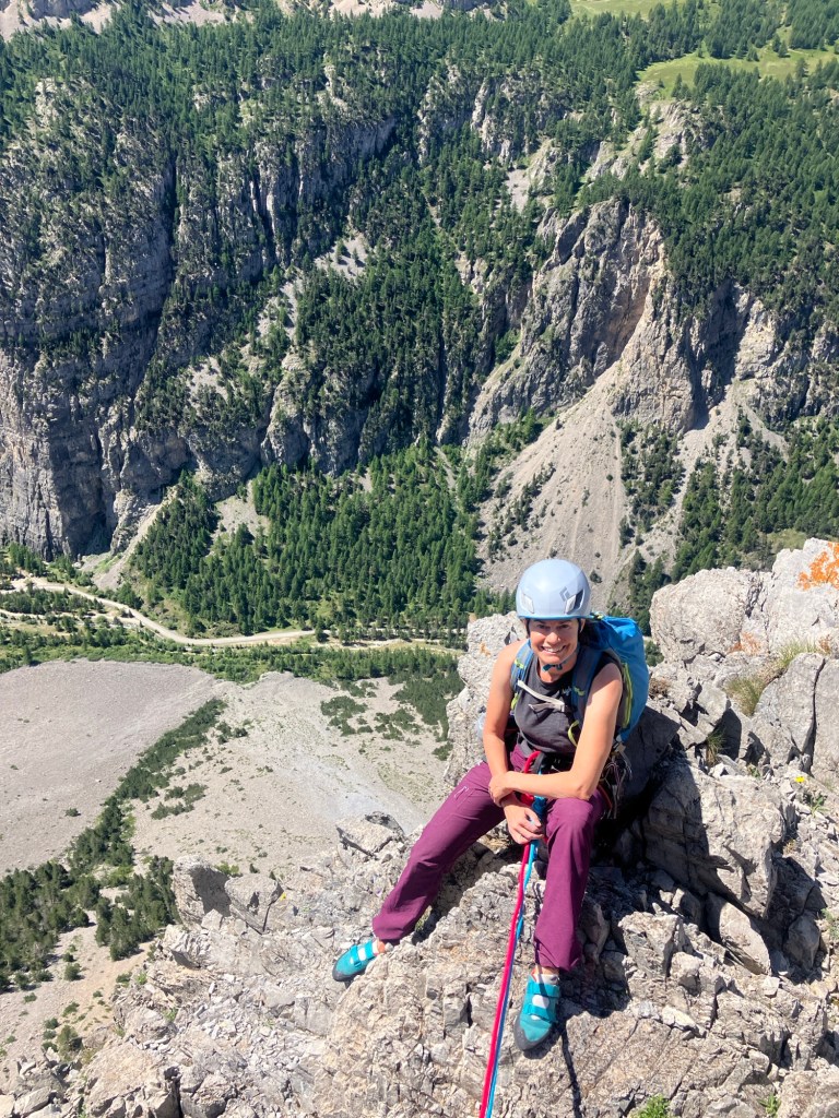 I had led a pitch up to a stance that the guidebook had translated as ‘Ariel’. It tuned out to be an outrageously exposed position, high above the scree slopes. I had a small ledge to stand on and two high bolts to clip. Once attached to these, I had to lean back over the 100m or vertical drop and let the ropes take my weight as Clare came up to join me.