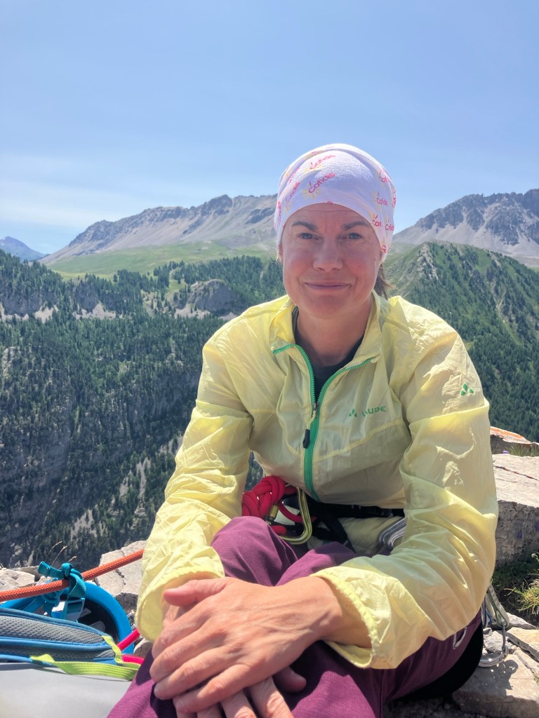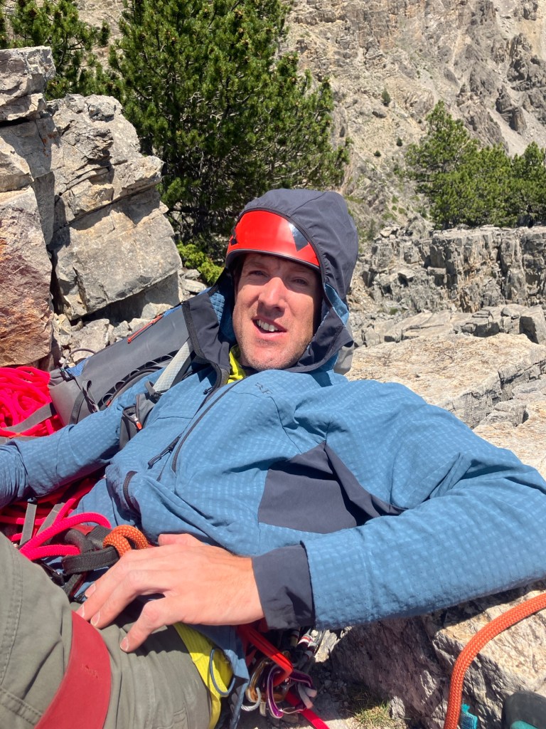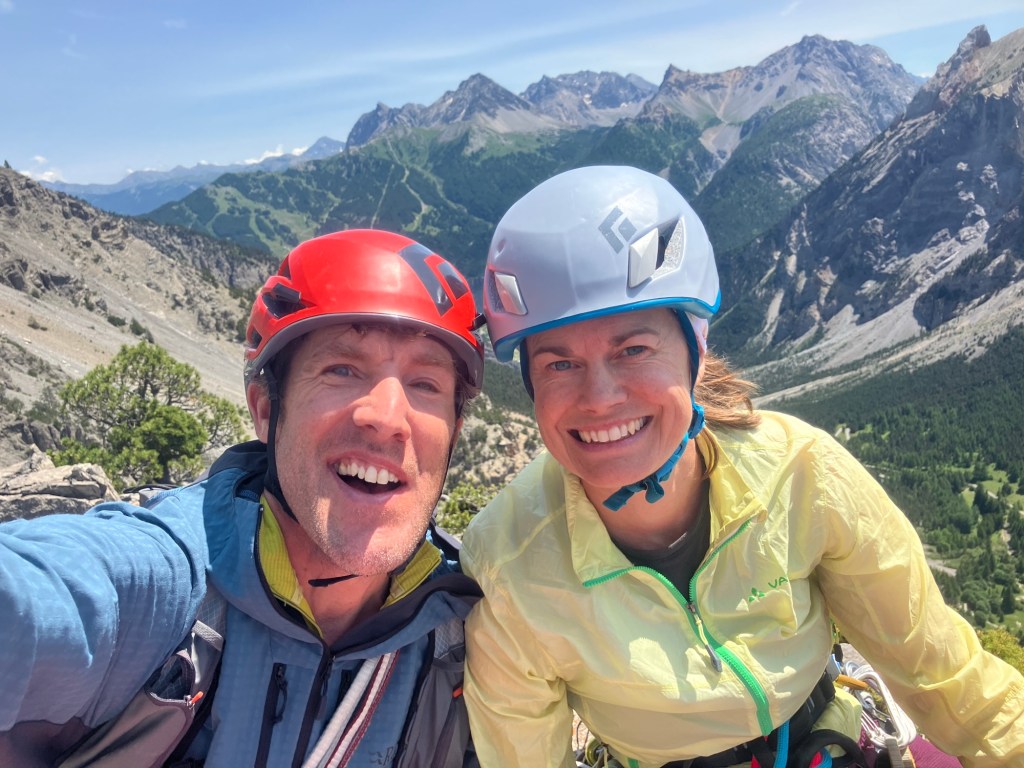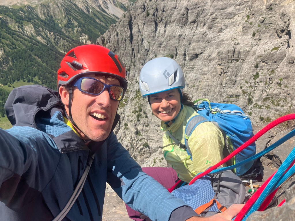 Tied to a piton at the foot of the Madonna, we took off our packs and had some food and drink, while giggling nervously and spontaneously letting out great sighs! We still had to get down of course, so couldn’t properly drop our guard, but allowed ourselves a bit of rest and a short lie down, before working out how to get off the far, and as yet unseen side of the peak.