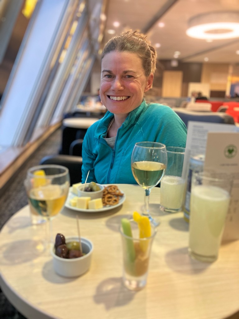 As a final treat, we took ourselves out of the chaos of the main ferry and relaxed in to a quiet corner of the upstairs ‘lounge area’, where complimentary drinks and nibbles were laid on. A perfect place for two tired cycle tourer to kick back and relax while the boat crossed into the darkness of the Irish sea.
