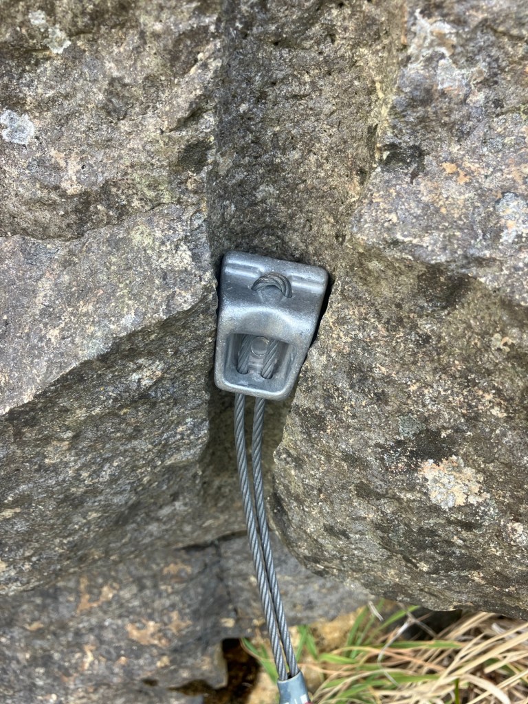 As anticipated, the rock was a bit overgrown in places, had some loose holds in places and the first route we tried had no protection until about 10m up! Care was certainly needed. Having retreated from our first attempt, we climbed a better route on which we could see plenty of cracks to place protection in. The best bit was this quarry bore hole – the perfect placement!