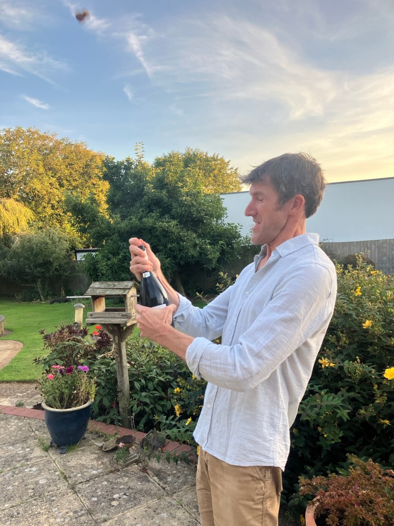 Then later, at sunset, fired off a Prosecco cork as a toast!