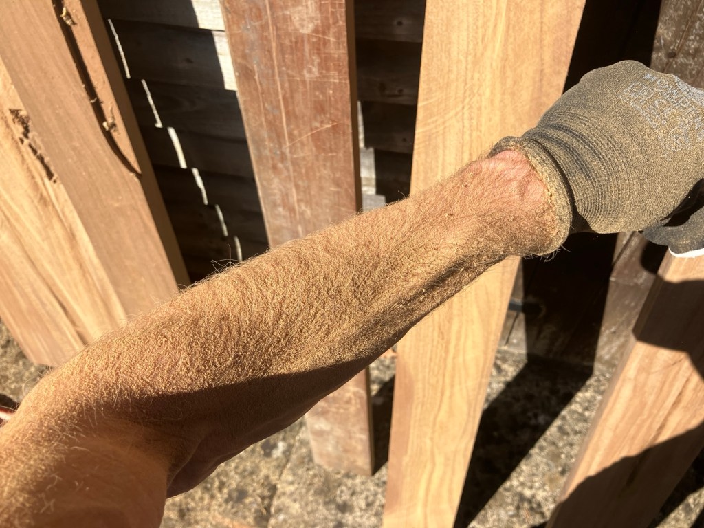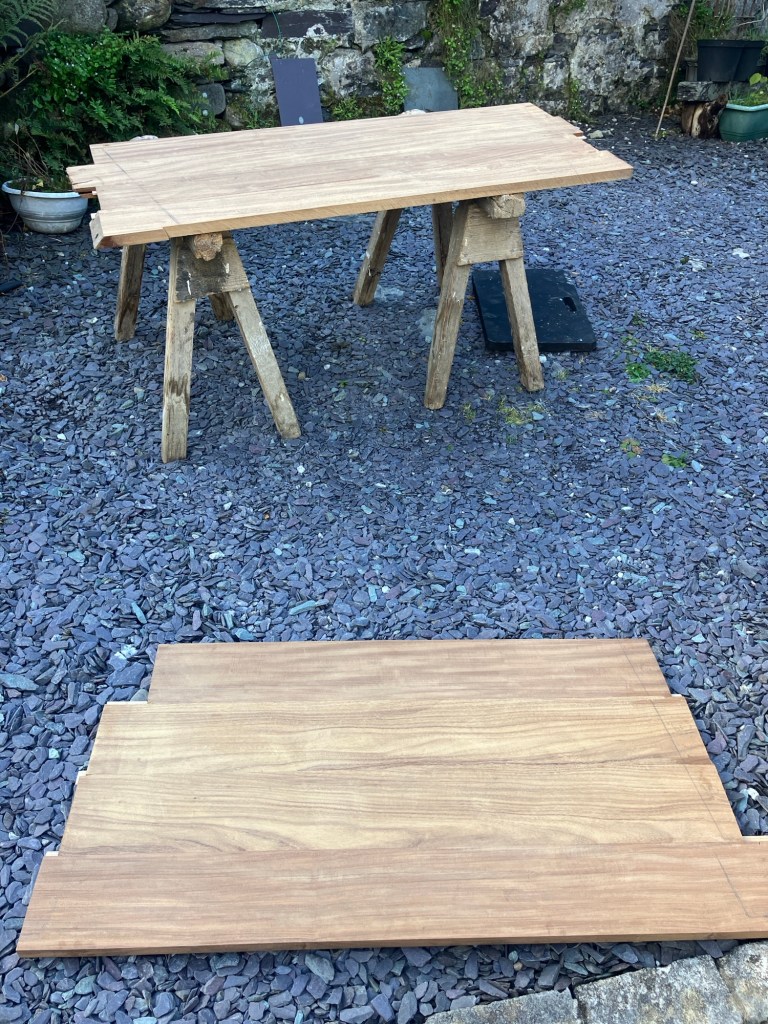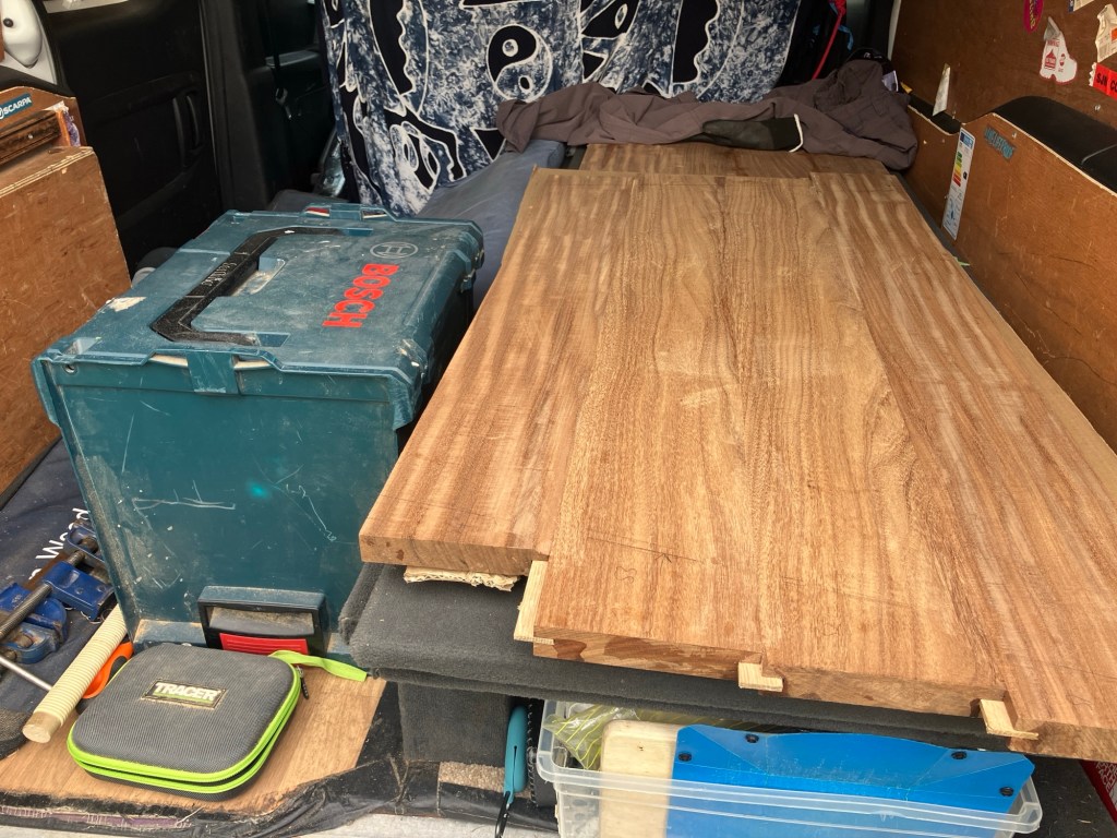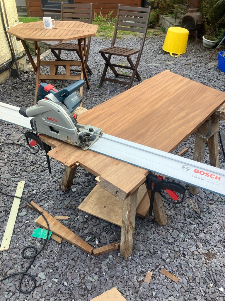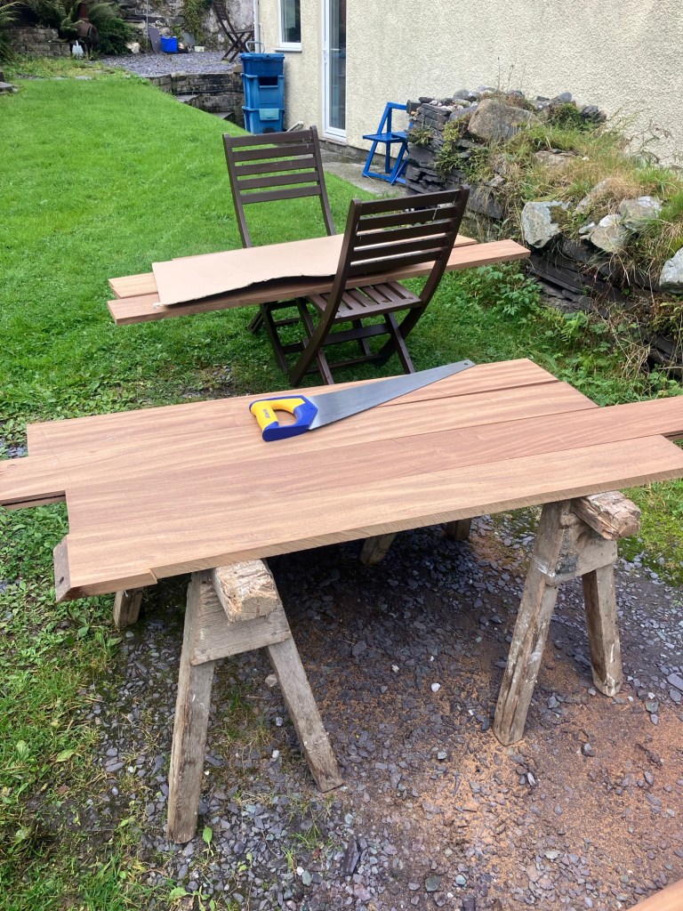 We were soaked in sweat and literally covered head to toe in dark saw dust. Tea on the terrace was required before we could load the new ‘thinner’ (yet still incredibly heavy) planks, back into the van and make our second trip to see ‘Jeremy the Joiner’. This time, he was able to use his big planer to even up our work and add in a small groove on the edges to help stick them together. We returned to the Den, to try and clear up the small mountain of saw dust that had accumulated in the door way.
