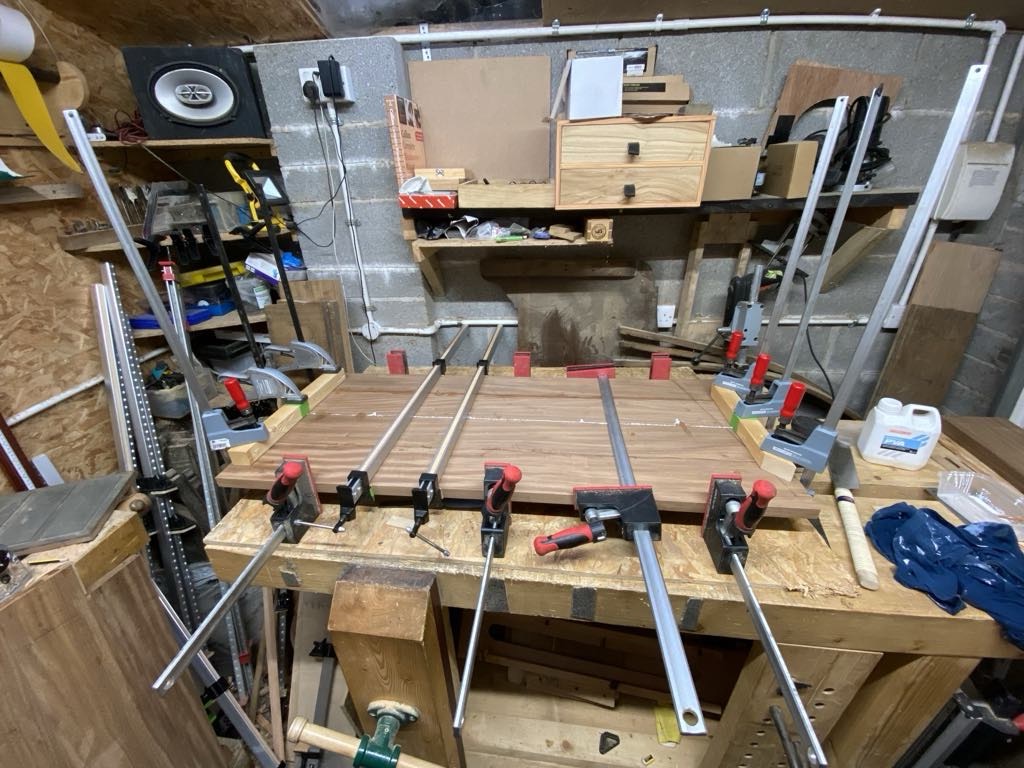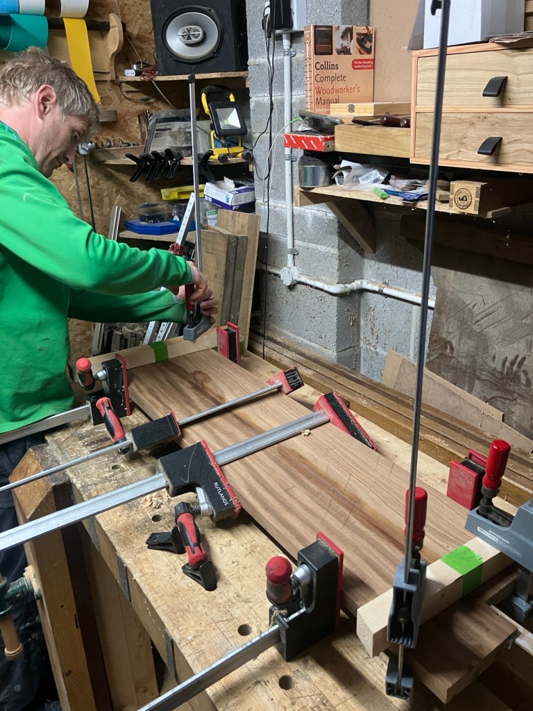 As it turned out, sticking together a couple of small lengths was a much easier operation than doing the same for a 1.5m length of wood. Up until now, my workshop had been in the back of the van, so I enlisted the help of Matt and his workshop. It soon became clear that Dad’s two large sash clamps were going to be woefully inadequate. Luckily there seemed to be no shortage of supply at Matt’s place. At one point there were twelve clamps holding it all together and flat!