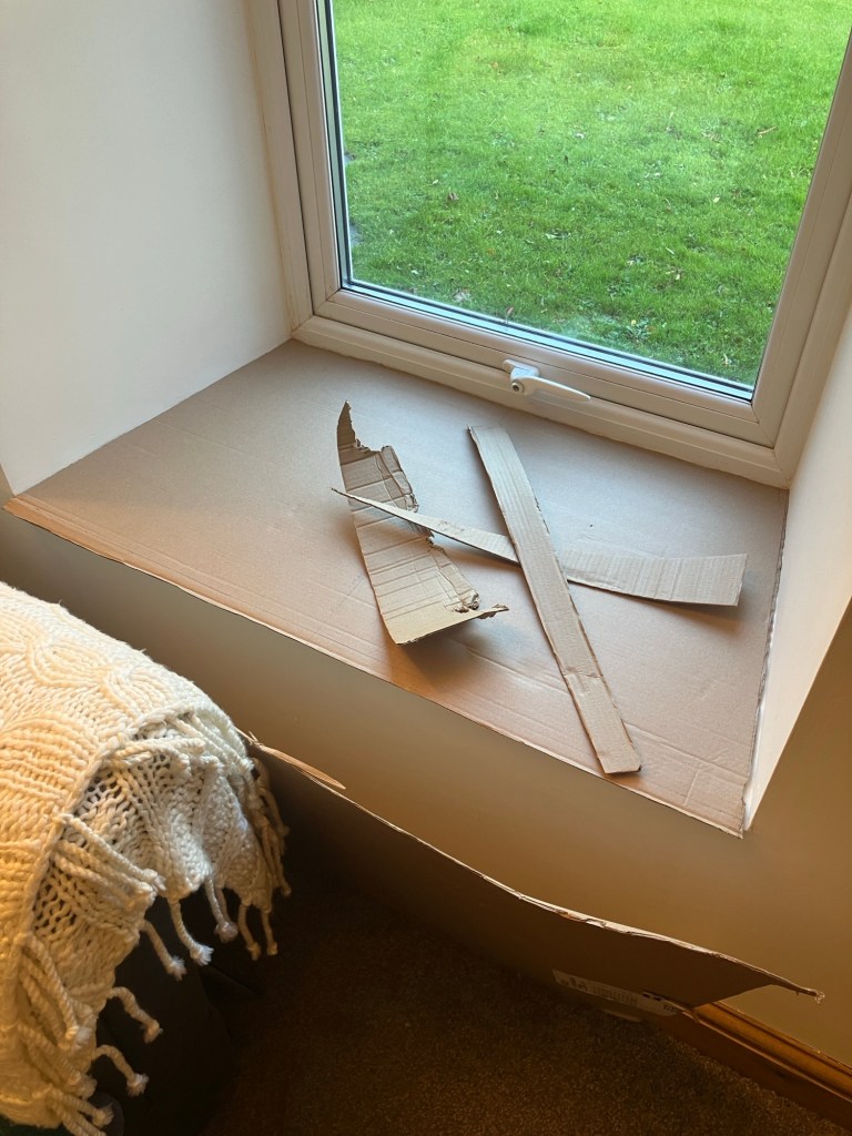 Cutting the boards to the correct shape then became the next project and having taken so much time and effort to get this far, it was with some trepidation that I measured and re-measured about hundred times. I took Howard and Matt’s advice and made a template from some cardboard, as none of the walls are straight or involve an right angle.