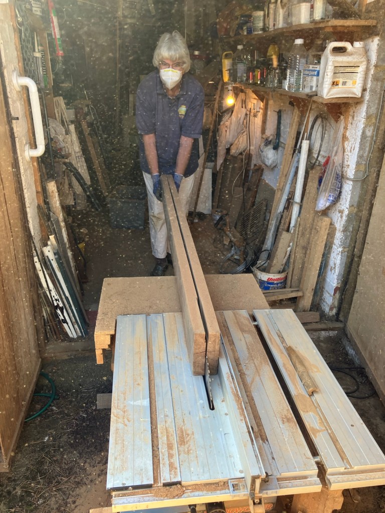 In what can only be described as a ‘health and safety nightmare’ we got fully involved with the challenge of using the big table saw. Having (very sensibly), tried to get this part done at a joiners shop, we were turned away as they didn’t have a big enough saw and couldn’t take the safety guards off their table saw. Somewhat deflated, we returned to The Fort, to discover that there were no safety guards to remove on Dad’s gear – so psyched up with masks, goggles, ear plugs and revved up the beast! It was a nerve wracking affair ripping the thick planks through the huge circular blade that looked like something from a horror film. With great care, and in a blizzard of saw dust, we tore through the first few and after thinking we’d blown a fuse, kept the blade turning long enough to make the final cuts with all our fingers and limbs intact.
