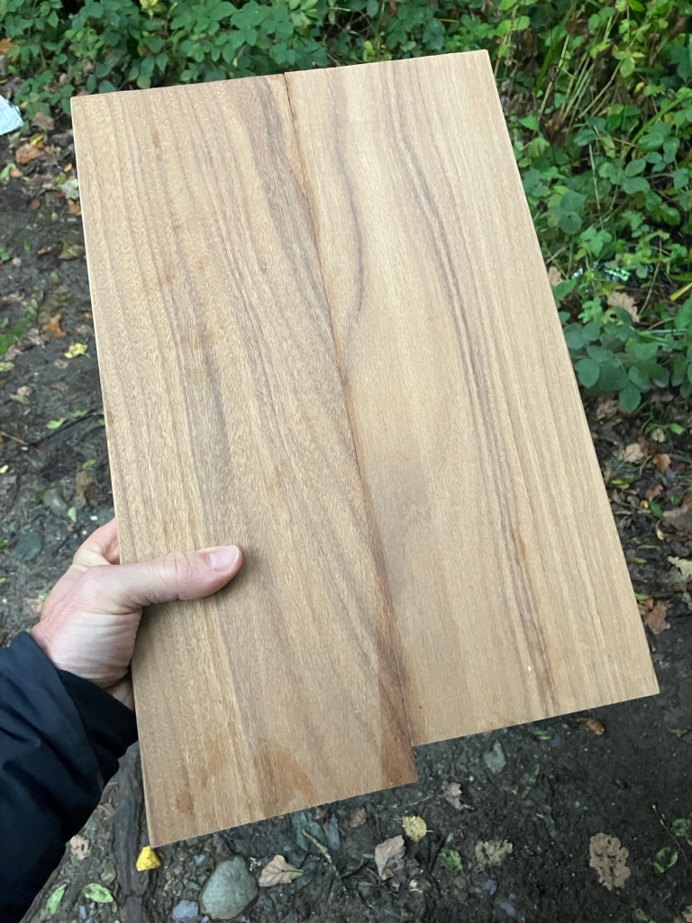 With the wood now stuck together as boards, there was the small matter of planeing them smooth, using a small metal sheet, to scrape away the excess glue and level things up. A incredibly addictive experience and painfully fatiguing on the thumbs, but, as promised, it did give a good looking surface.