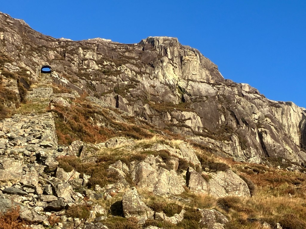 To be honest, it did take a bit of motivation to get up in the dark and drive through the frosty valley past Betws y Coed. It promised to be a beautiful morning and even the drive there was worth getting up for as mist hung over the river, low in the valley. Up at the crags, as promised, the sun was shining! Despite the attraction of a descent through a little tunnel, we walked past the first Wryscan Cliffs, and onto Colgwyn yr Oen.