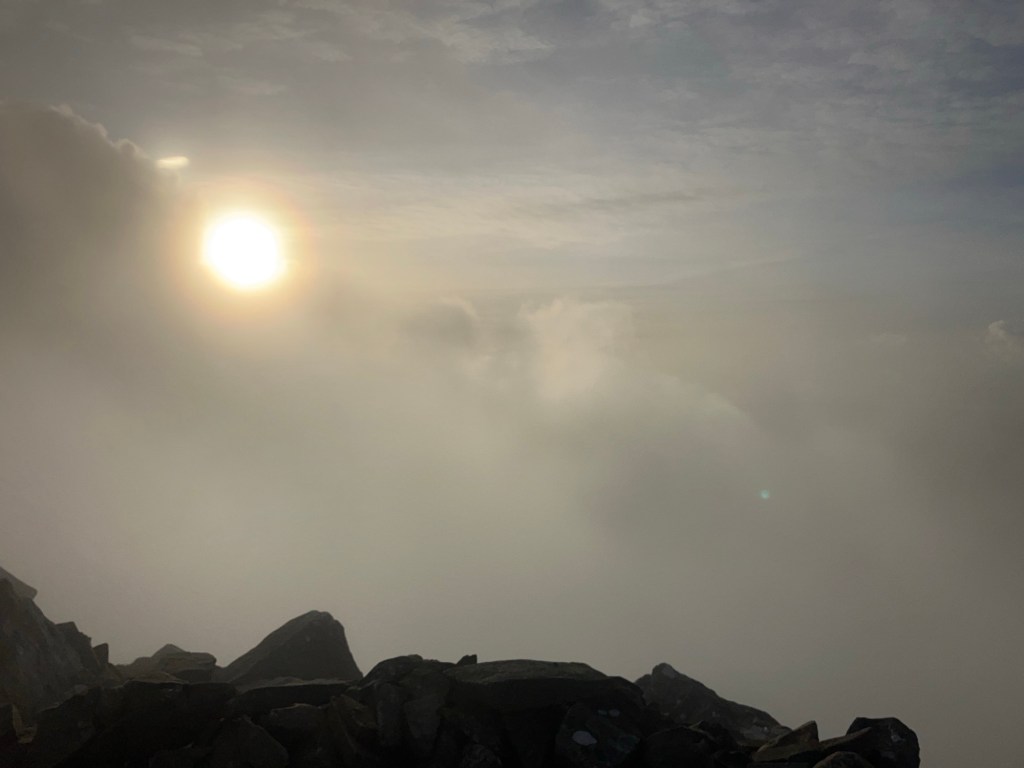 As we neared the summit, the clouds that we’d ascended into began to thin and suddenly, we broke through the upper levels and into blue sky and warm sunshine!