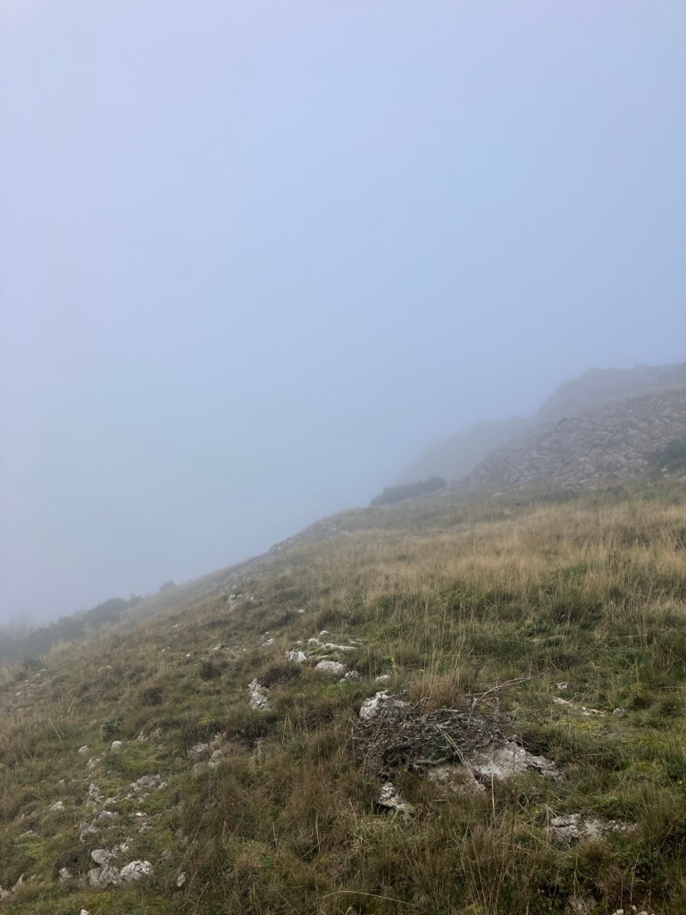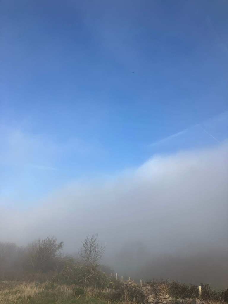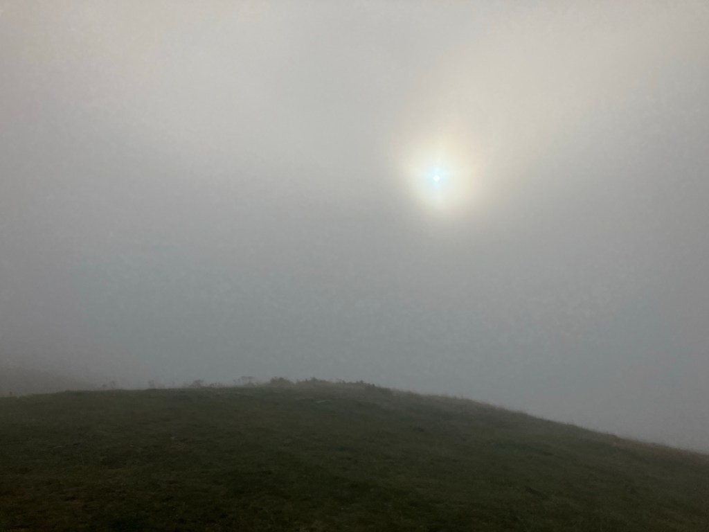 As we descended to the fields, the mist got even thicker. It was a real ‘pea-souper’ with visibility down to just over 50m.