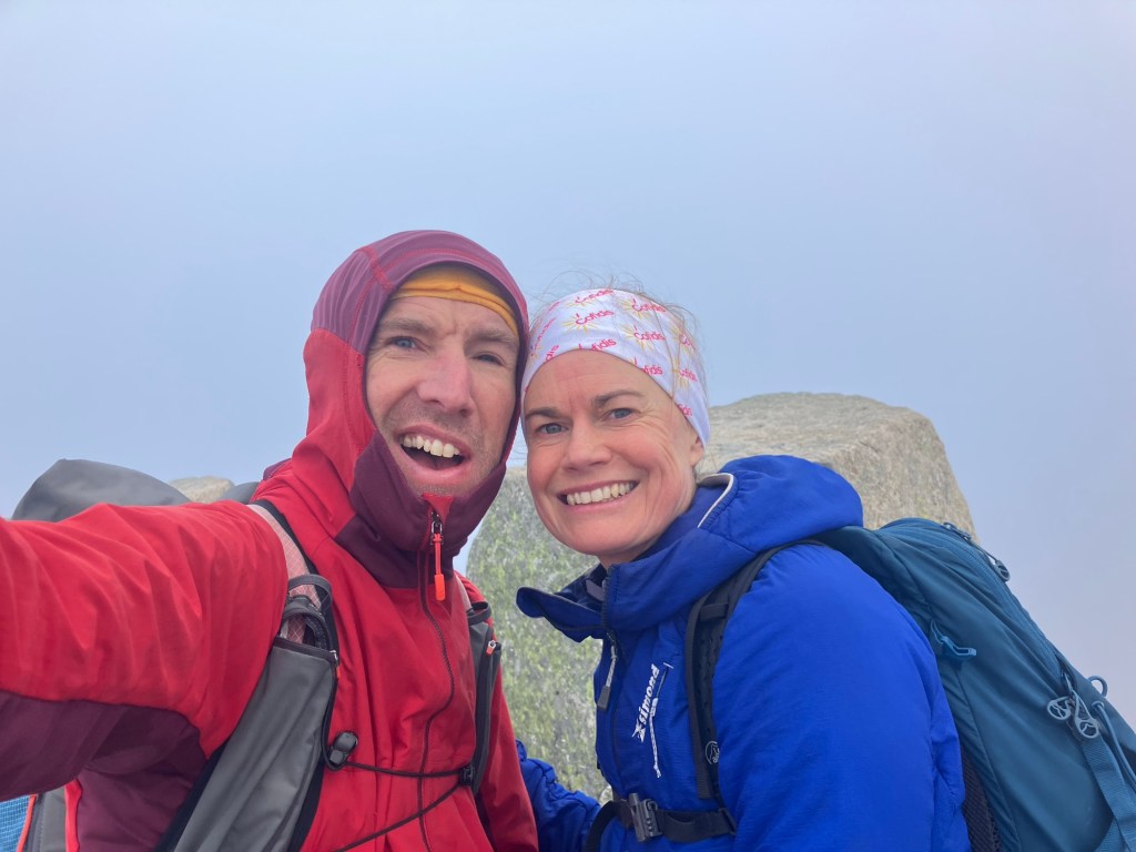 Happily, the wind abated at the summit, so we sat and enjoyed a sandwich by ourselves, with the limited views.