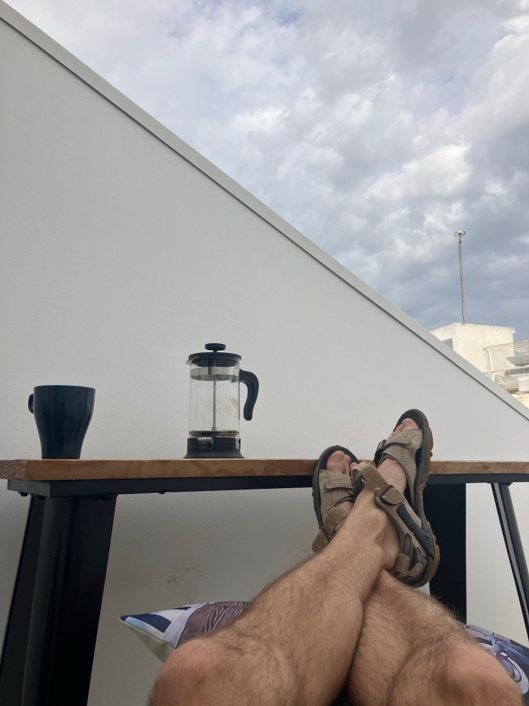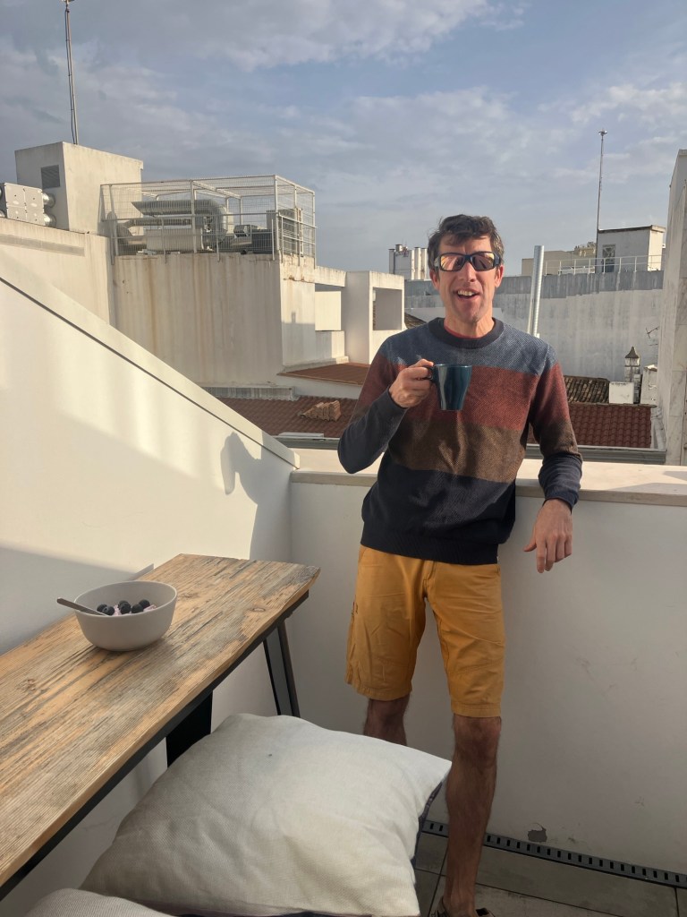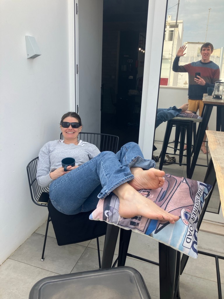 In the morning, we were delighted to find it was warm enough to have shorts on and enjoyed a slow breakfast on the terrace!