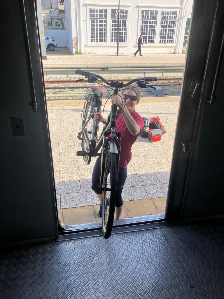 Tickets had to be purchased in the train in cash. The waiting train seemed to be ours, but where to put the bikes remained unclear. A helpful man opened up a cargo door that had a ‘no entry’ sticker on it and gesticulated that this was absolutely fine and normal, so without further a-do, I climbed up and in. There were no steps, so I literally did have to climb up and in to the train. Clare passed up the gear and then clambered up herself.