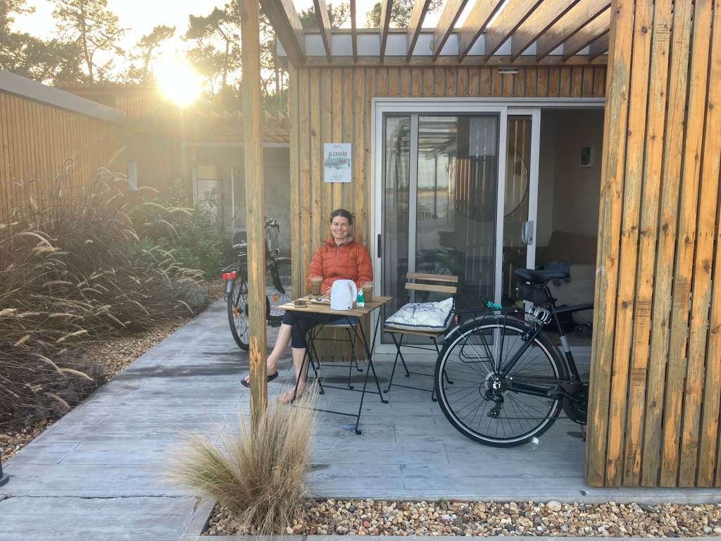 But today, we had just a few kilometres to go to our overnight accommodation in a little chipboard cabin. It’s a busy summer resort with infinity pool by the waters edge, but today, it’s pretty much closed. Even though we had booked to stay, they were not expecting us and had to open a cabin up for us. On the plus side, there’s just us staying and we have a private resort to ourselves! (Although the guls seem to have commandeered infinity pool).