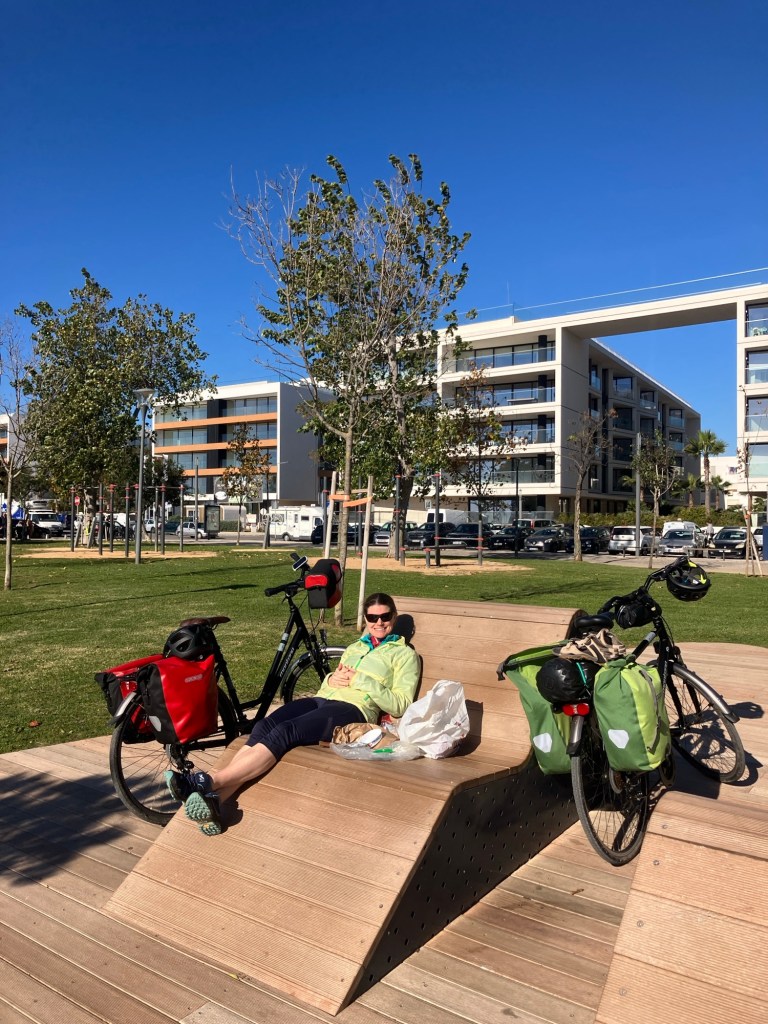We had to unload, carry the bikes and push through deep sand to reach the promenade, which led eventually to the hotel in Quarteira.