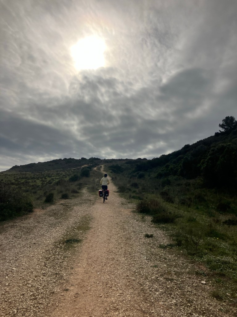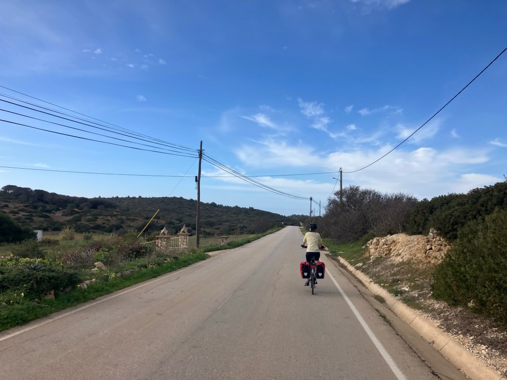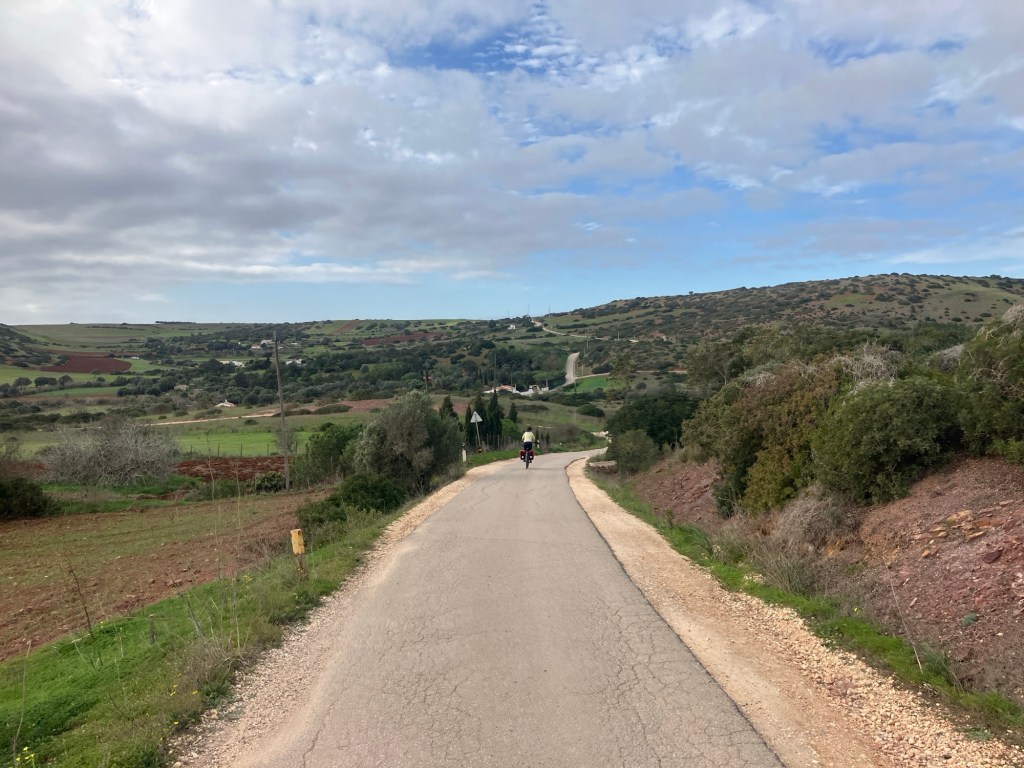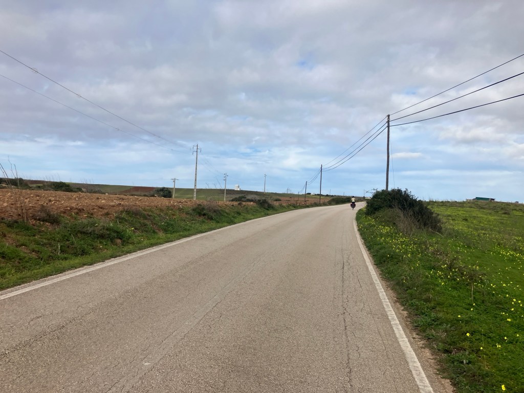 Then, to leave the beach town, we found ourselves heading up another steep road! This time I had to cycle standing up in order to maintain any forward momentum! Soon after, an ‘abandoned’ looking town led us into some empty agricultural land, with gentle rolling hills.